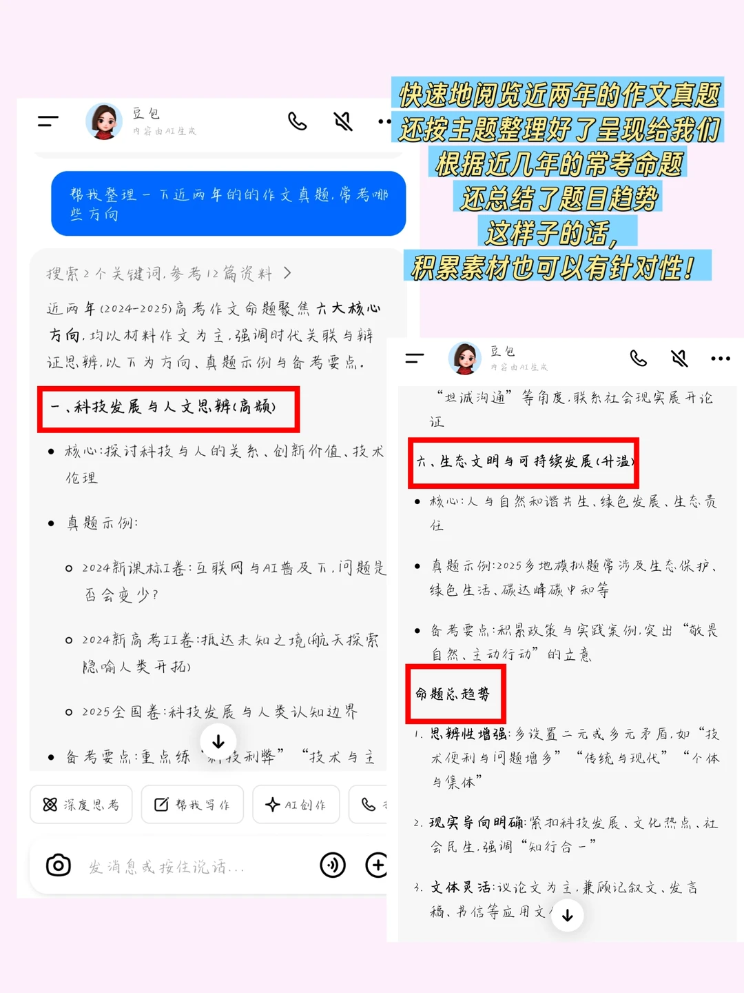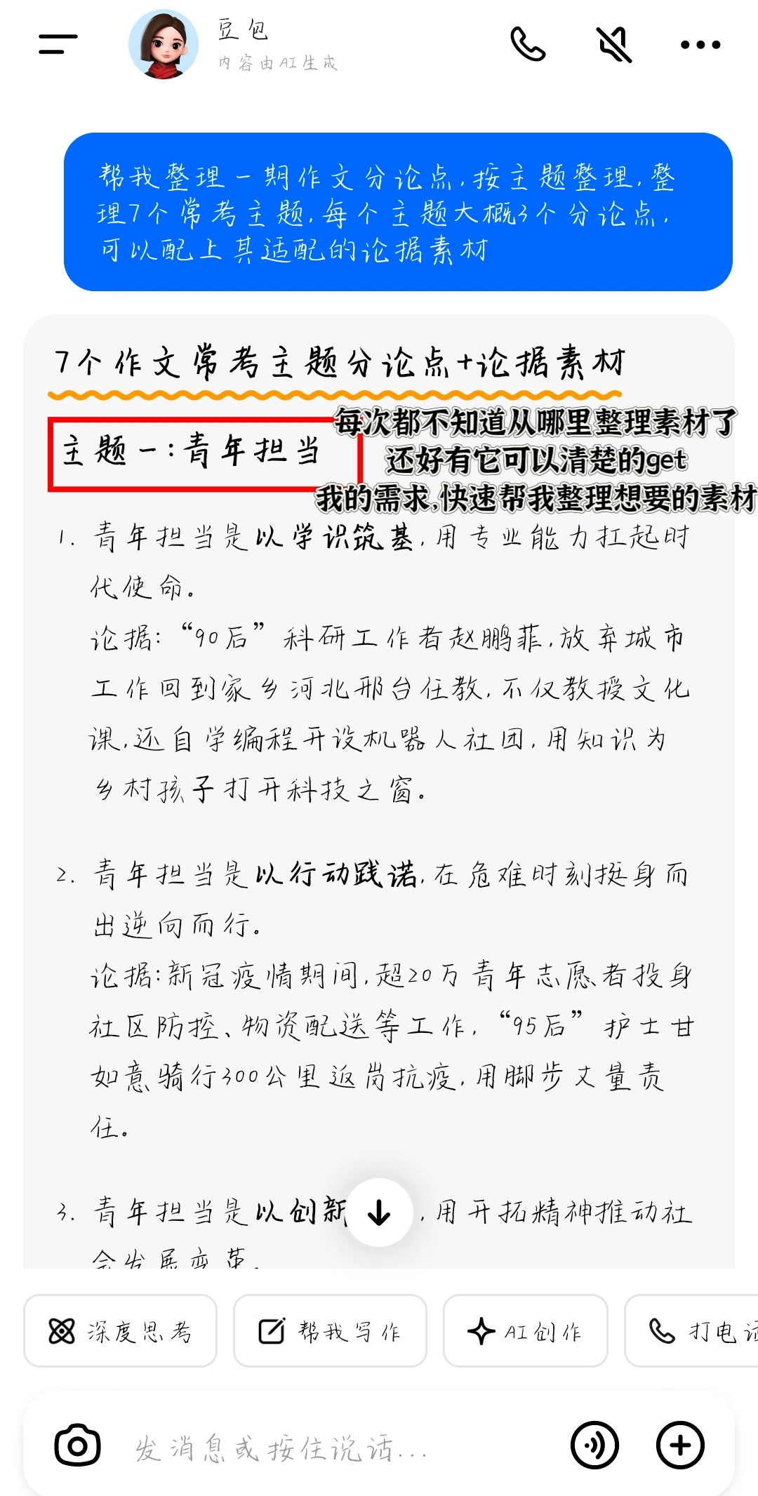 分论点 + 论据打包出:给主题(比如 “青年担当”),直接出配套的论点 + 人物 / 事例素材,不用自己拆分找;