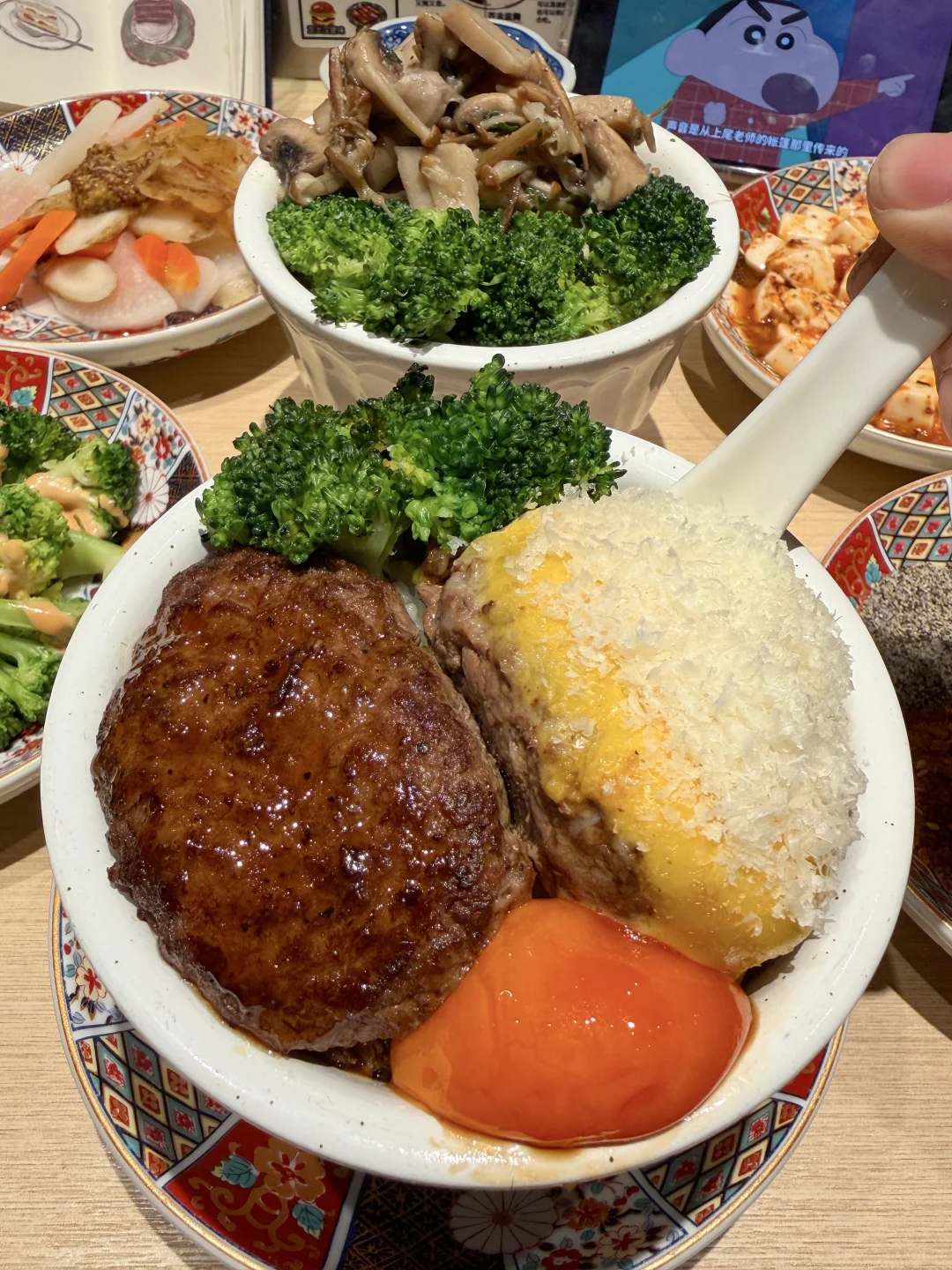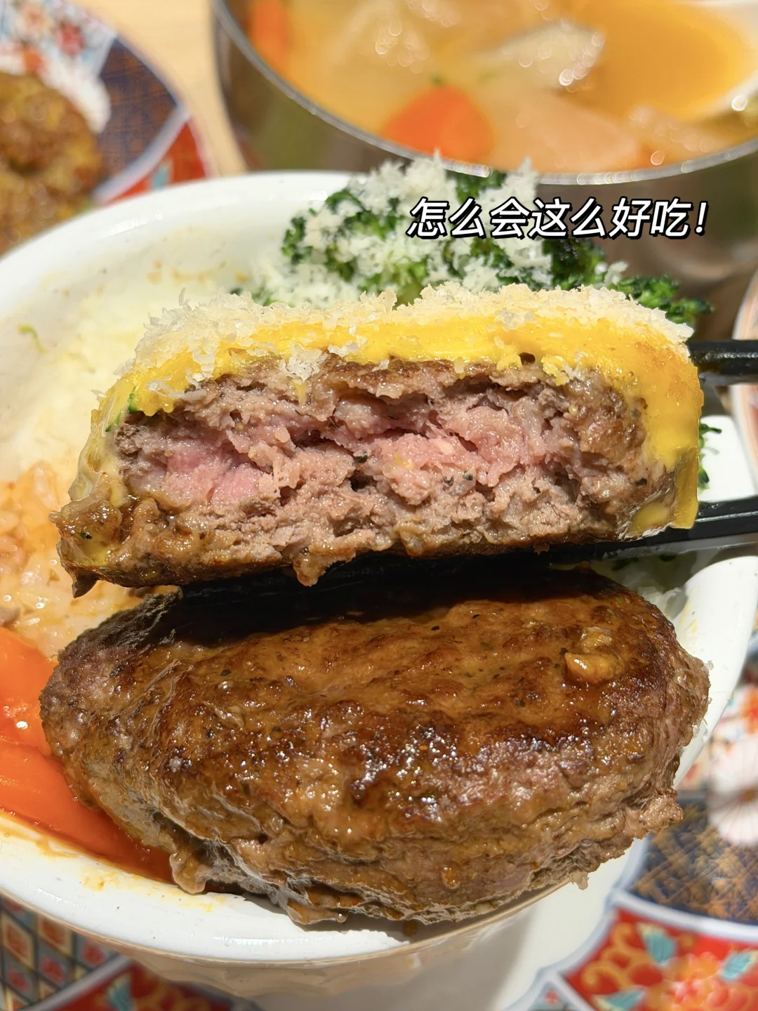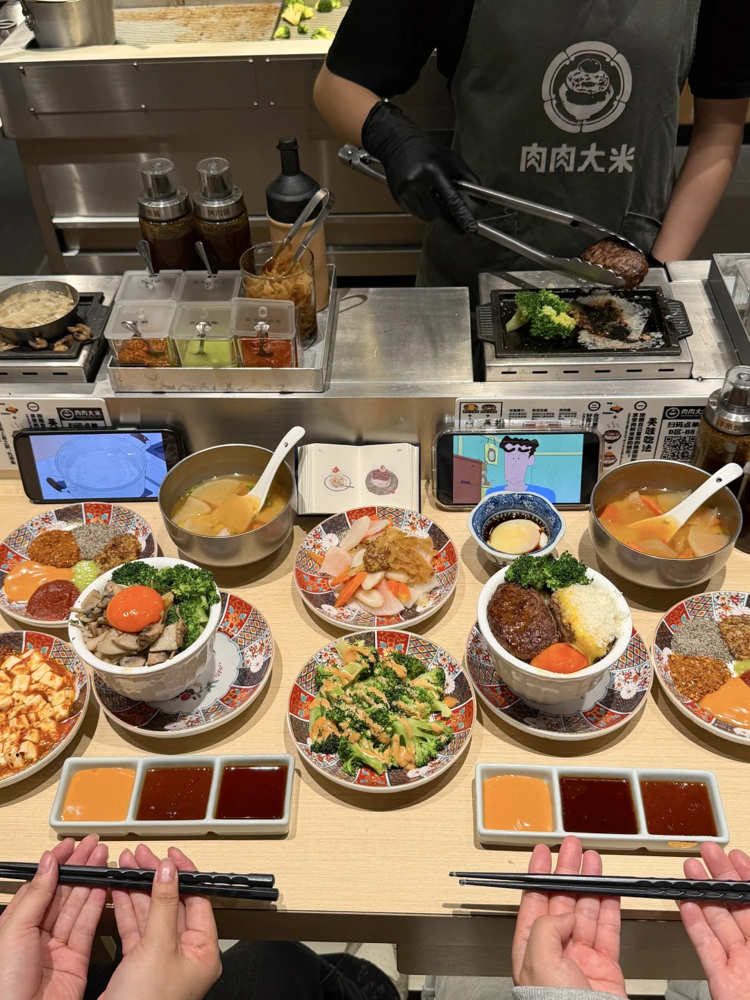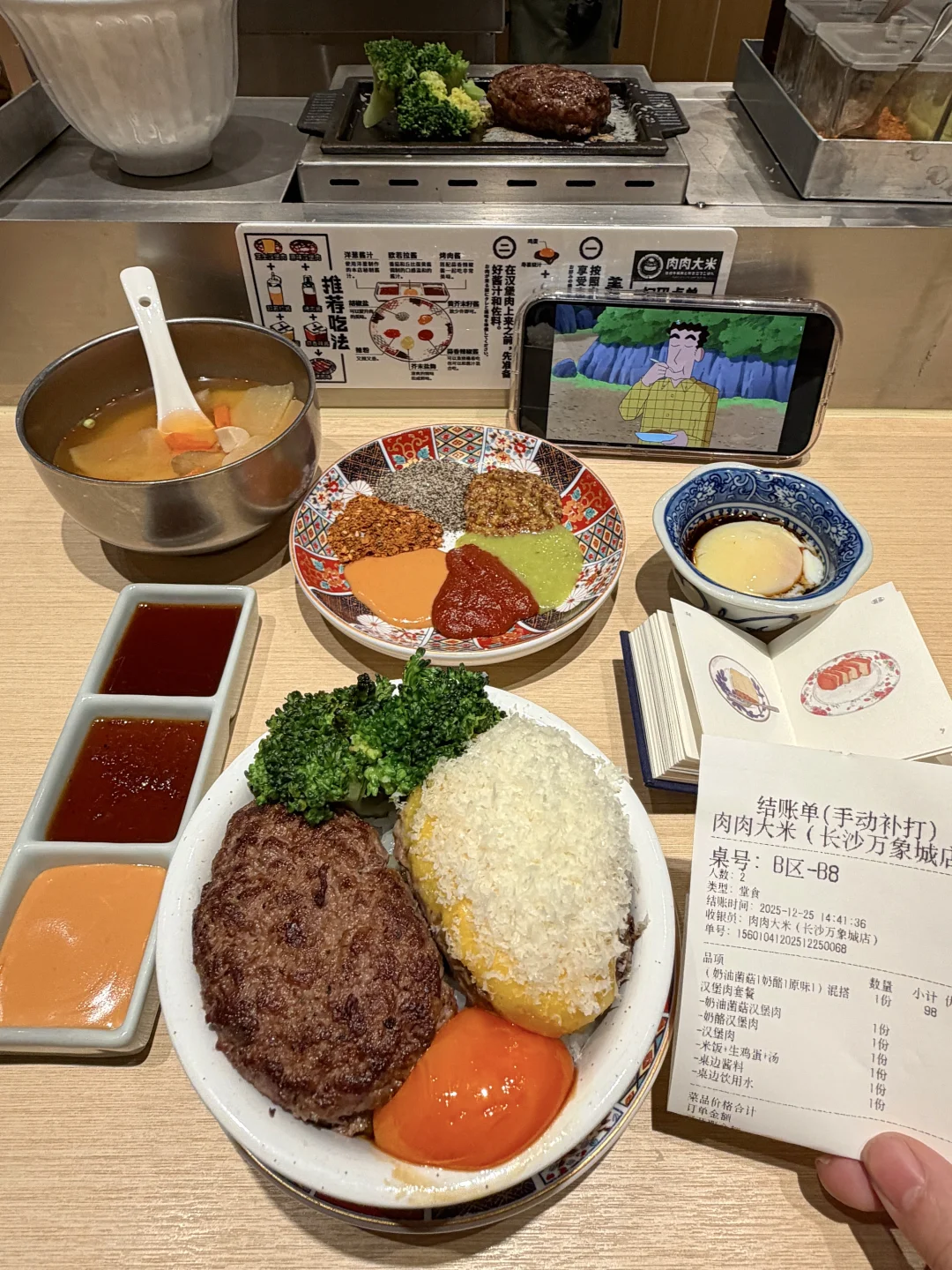 好适合约会的温馨小食堂😭叫:肉肉大米。价格不贵好好吃啊!!就在万象城!!是我反复去吃的平价宝藏小店了!环境很有氛围感!服务也好! 肉饼现煎的,很扎实有料!比长沙大多数同类型店要划算好吃!!味增汤、西兰花、米饭、都是免费无限续…桌上8种酱可以自由搭配DIY,好满足!隔段时间没来就会想念这一口…