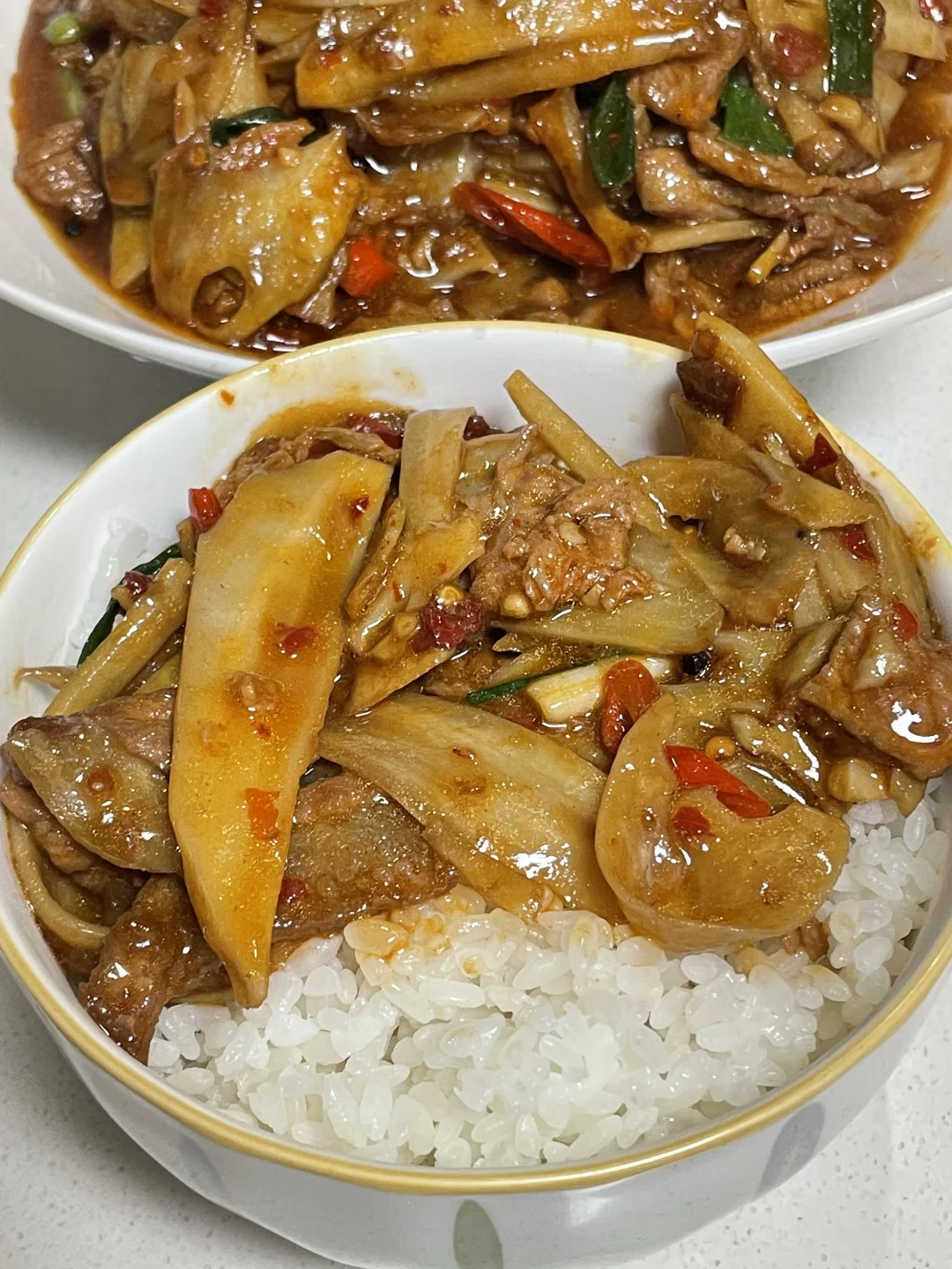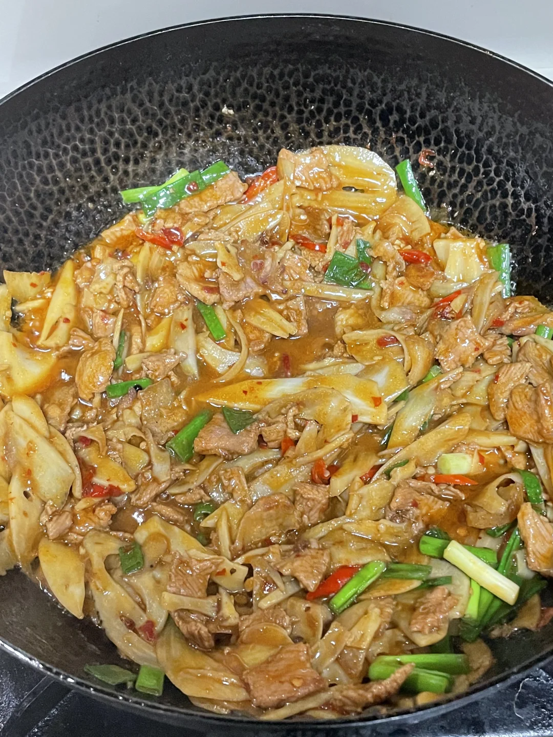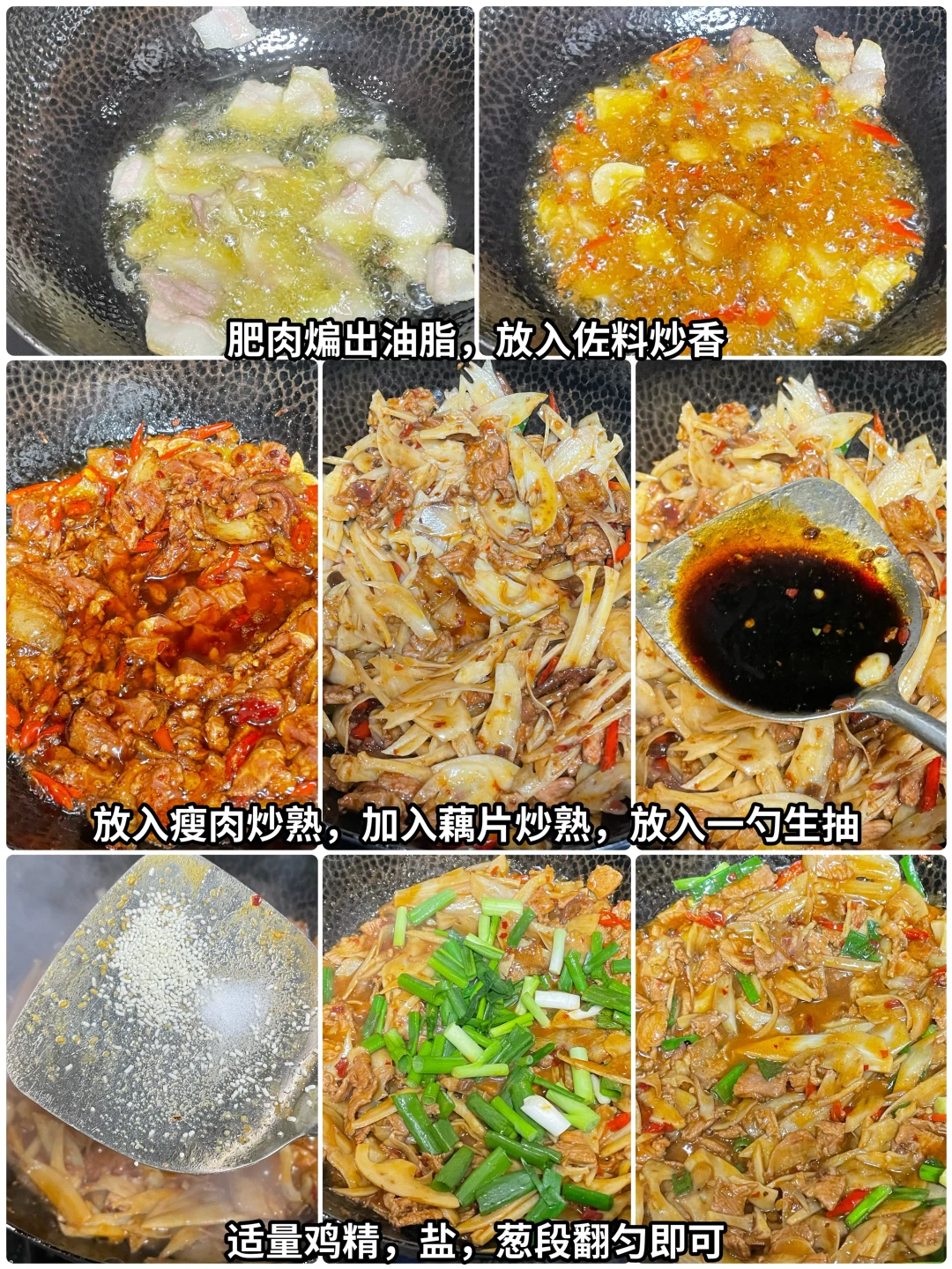 3⃣️起锅少油,油热将肥肉煸炒出油脂,然后放入蒜,小米辣花椒糍粑,辣椒炒香,然后倒入瘦肉炒熟,加入莲藕翻炒均匀,炒断生之后,放入1勺生抽,适量的盐和鸡精拌匀之后加入葱段拌匀即可出锅。这样做出的莲藕炒肉真的巨好吃,喜欢的姐妹去试试吧