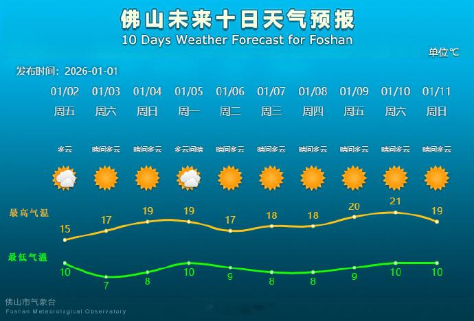 受冷空气影响,1日夜里到2日早晨佛山市北风加大至3到4级,阵风5到6级,2日08时各区气温10.4到10.7℃,较1日同期下降4到6℃。预计2、3日两天冷空气继续影响,多云到晴,3日早晨将出现过程最低气温,约7℃。请做好防风防寒保暖措施。佛山市气象台2026年1月2日8时15分发布