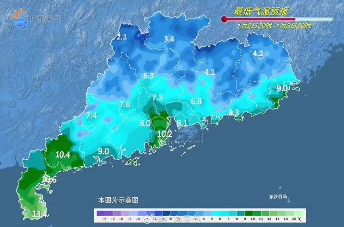 广东省气象台预计,元旦假期(1月1日—3日),受较强冷空气影响,广东将有降温大风天气,1月2日—3日多云到晴。冷空气前锋于1月1日早晨影响粤北、傍晚前后到达广州、夜间到达南部沿海,广东中北部市县气温下降7℃~9℃、南部下降5℃~7℃,陆地有5~7级阵风,广东海面有6~8级偏北风,阵风8~9级。