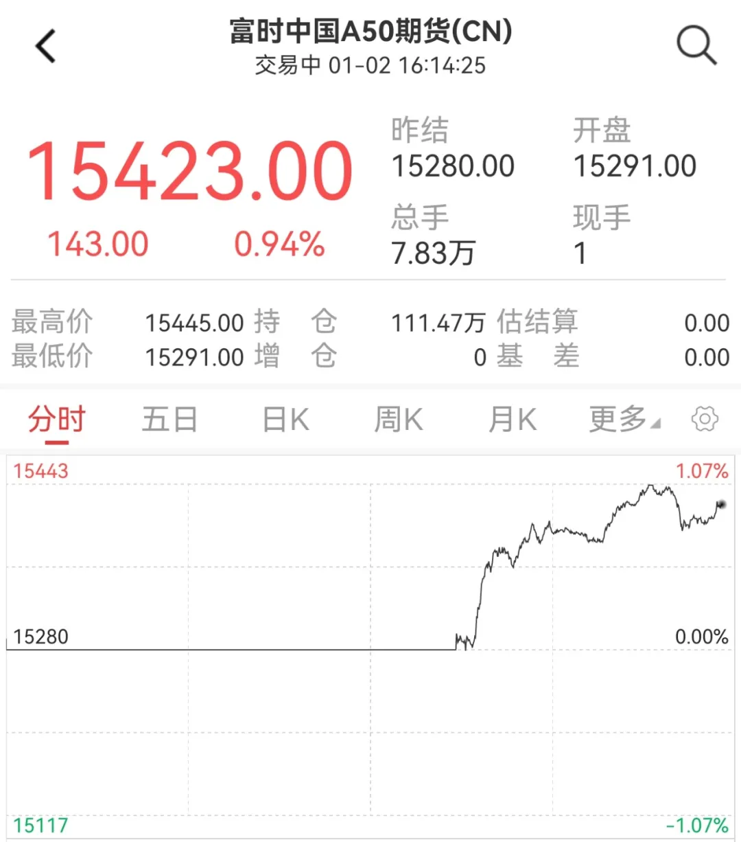 富时中国A50指数期货直线拉升,突破15420关口,日内涨近1%。