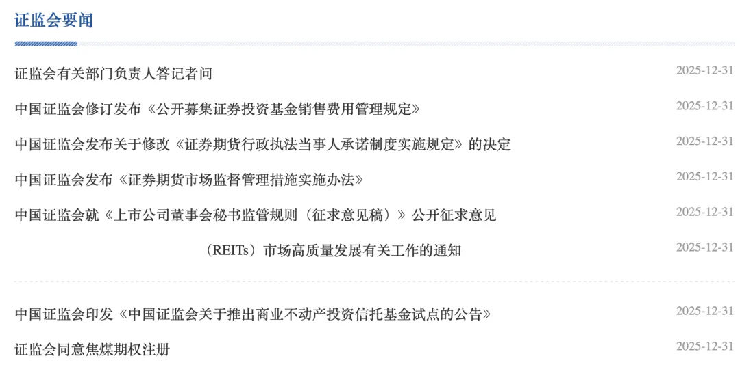 2025年12月31日,证监会发布《中国证监会关于推出商业不动产投资信托基金试点的公告》《关于推动不动产投资信托基金(REITs)市场高质量发展有关工作的通知》《上市公司董事会秘书监管规则(征求意见稿)》《证券期货市场监督管理措施实施办法》。同时,对《证券期货行政执法当事人承诺制度实施规定》进行修改完善,并修订发布《公开募集证券投资基金销售费用管理规定》。