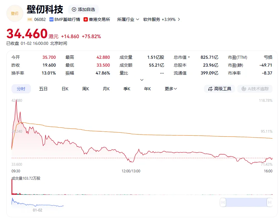 值得关注的是,1月2日,“港股GPU第一股”壁仞科技在港交所挂牌上市,成为2026年港股市场首只上市新股。壁仞科技开盘后一度涨近120%,总市值超1000亿港元。截至收盘,其涨幅为75.82%,报34.460港元,市值约825.71亿港元。