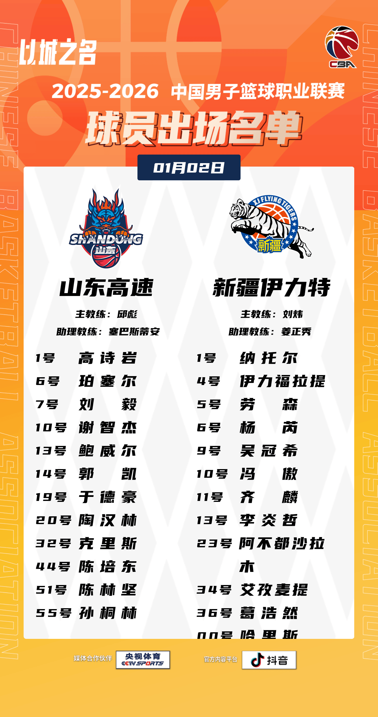 虎扑01月02日讯今晚CBA常规赛,山东对阵新疆大名单已经公布。
