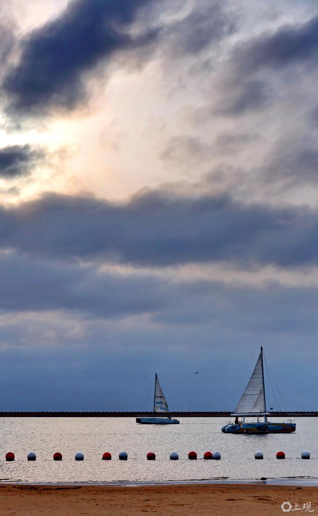 元旦当日上午8时许,在金山城市沙滩,市民游客期盼的2026年第一缕阳光终于冲破积云,洒在海面上,与行驶的游艇构成美妙的图案。