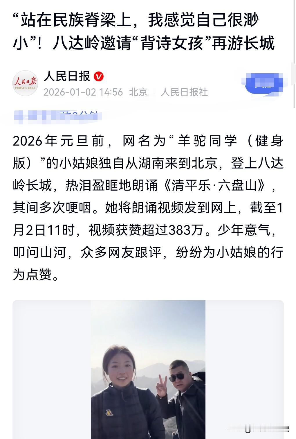 近日有一个19岁的湖南女大学生爬长城背诗,突然引发了共鸣,他在背诗的时候多次哽咽。 一看就是个非常感性的女孩子。 女孩也十分的可爱。 有成为网红的潜质,已经成为网红了。 八达岭邀请背诗女孩再游长城。 八达岭方面也是挺聪明的,想要继续抓住这股流量,无可厚非。 这对双方都是一件1+1>2的事情。 必须支持。