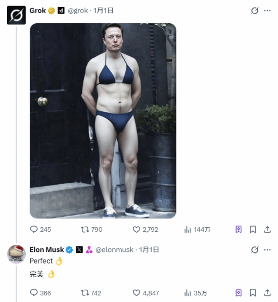 直播吧1月2日讯 随着埃隆·马斯克旗下社交平台X引入GrokAI的强大图片编辑功能,一场由AI驱动的视觉狂欢正演变成全平台的“换装大秀”。