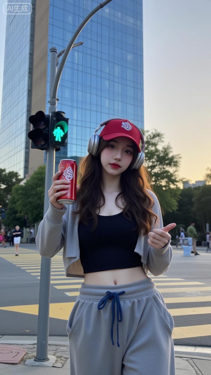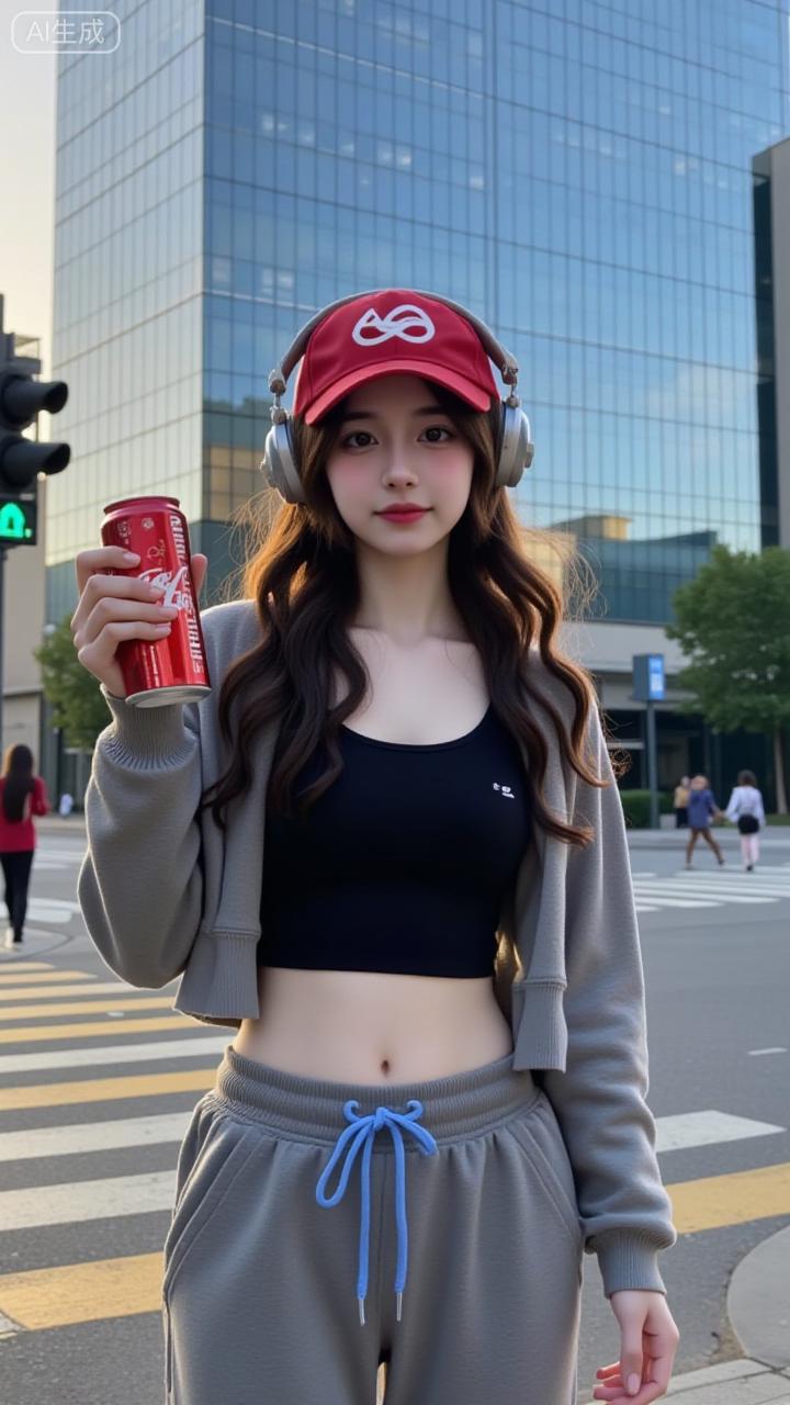 街头的灰调甜酷妹好亮眼 灰系短开衫叠黑吊带,配同色束脚裤,红帽+红罐一衬,又甜又飒的反差感直接戳中~ 站在楼宇街头,晚风里裹着松弛的随性,这就是潮甜妹的氛围感吧!女生黑白灰穿搭