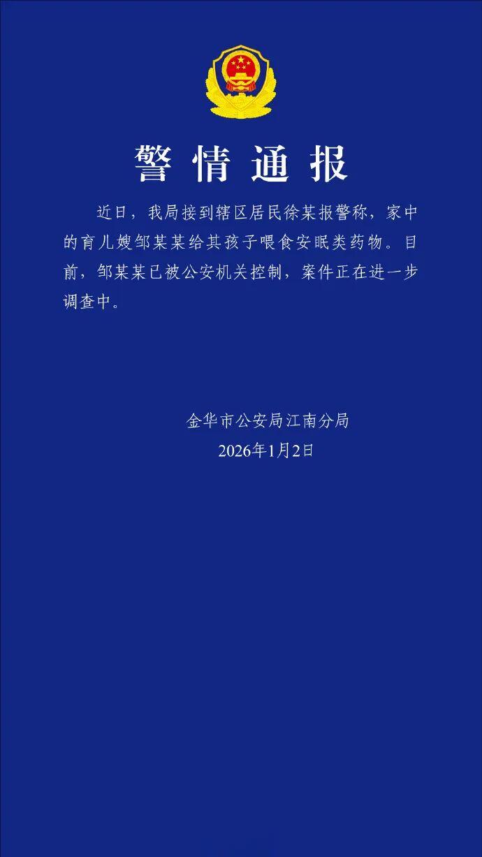 2026年1月2日,徐女士告诉潇湘晨报记者,她在永康可依家政公司以7600元/26天价格请了一位育儿嫂,她表示,2025年12月30日晚上,自己家龙凤胎男宝昏睡不醒,她与家人察觉异常后报警,并带宝宝去医院检查,发现体内有安眠药成分。