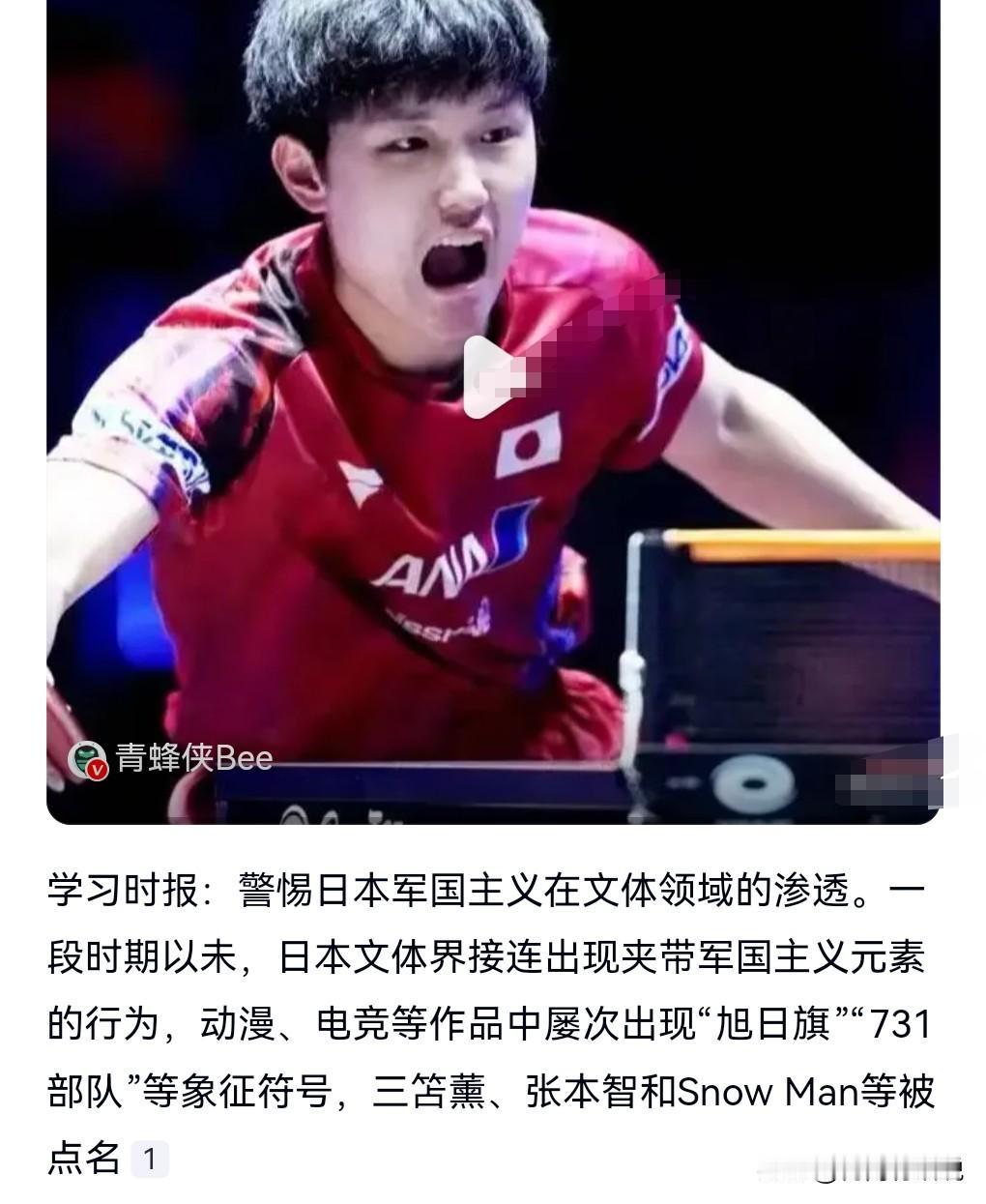 张本智和应该给我们中国人一个交代。张本智和被点名。 学习时报称,要警惕日本中国主义在文体领域的渗透。 日本文体界接连出现夹带中国主义元素的行为。 不光是动漫,而且电竞等作品中多次出现旭日旗、731部队等象征符号。 其中张本智和等人被点名。 张本智和的祖籍是中国人,所以他应该给我们一个交代。