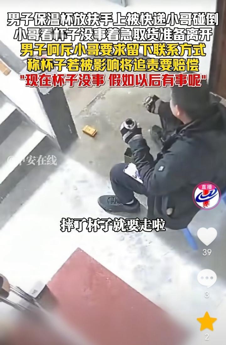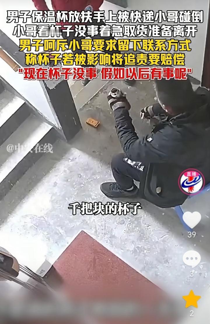 想讹人?上海,男子坐在楼梯道,他把保温杯放在楼梯扶手上,快递小哥送快递时不小心把保温杯碰掉在了楼梯上,快递小哥捡起杯子看没事,加上着急取货就准备离开,谁知男子不让快递小哥走,还让快递小哥留下联系方式,声称自己千把块钱杯子,现在看着没事,假如以后有事还的赔偿。 首先快递小哥是无意碰掉了男子杯子,其次杯子也没事,男子还得理不饶人的,直接把人性的恶发挥的淋漓尽致,还想事后有事找快递小哥赔偿,真不知道他是怎么好意思说出口的。 面对这种人就不应该惯着,理应报警处理,如果掉地上坏了让赔偿可以理解,但是杯子没有问题,他还抓住不放,这就有讹人的嫌疑。