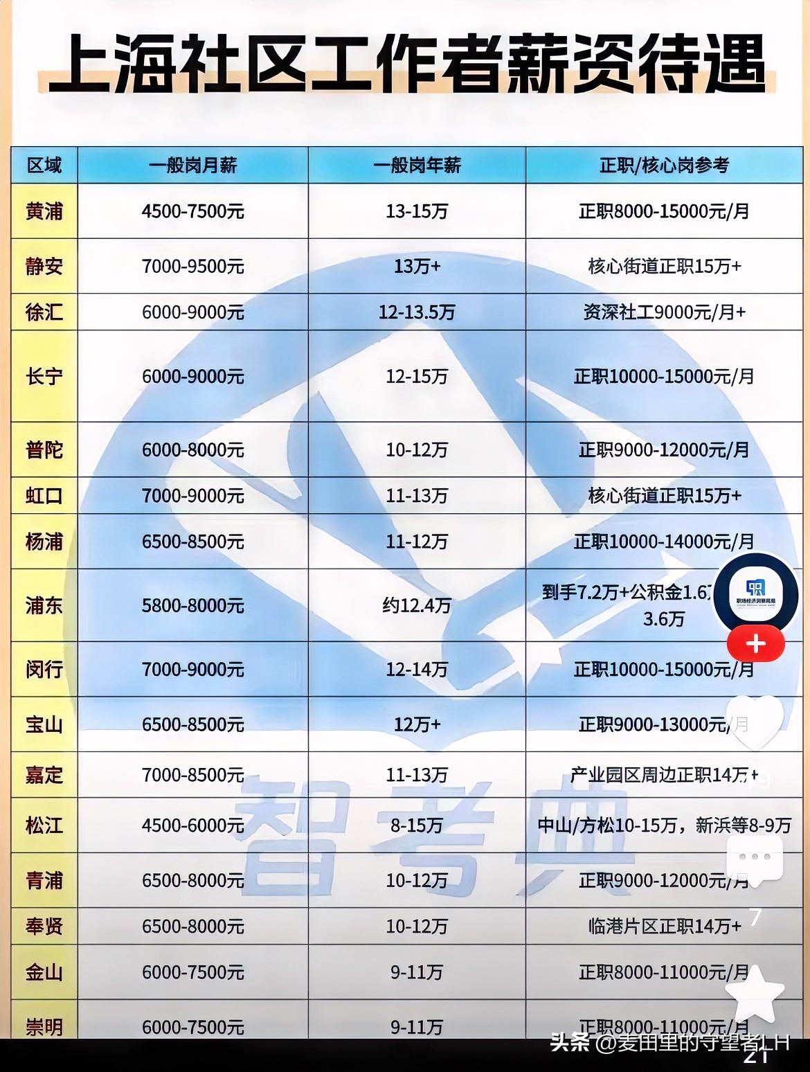 上海社区工作者,薪资待遇怎么样? 看到具体数字后,感叹不愧为一线大都市。 整个上海共分16个区:待遇最低的为松江区,一般岗位年薪8万起。 待遇最高的为,黄浦、静安二区,年薪最低13万。 其次为浦东区,年薪12.4万。 再次为徐汇、长宁、闵行、宝山,12万/年。 第四档为虹口、杨浦、嘉定,11万/年。 第五档为普陀、青浦、奉贤,10/年。 第六档为金山、崇明,9万/年。