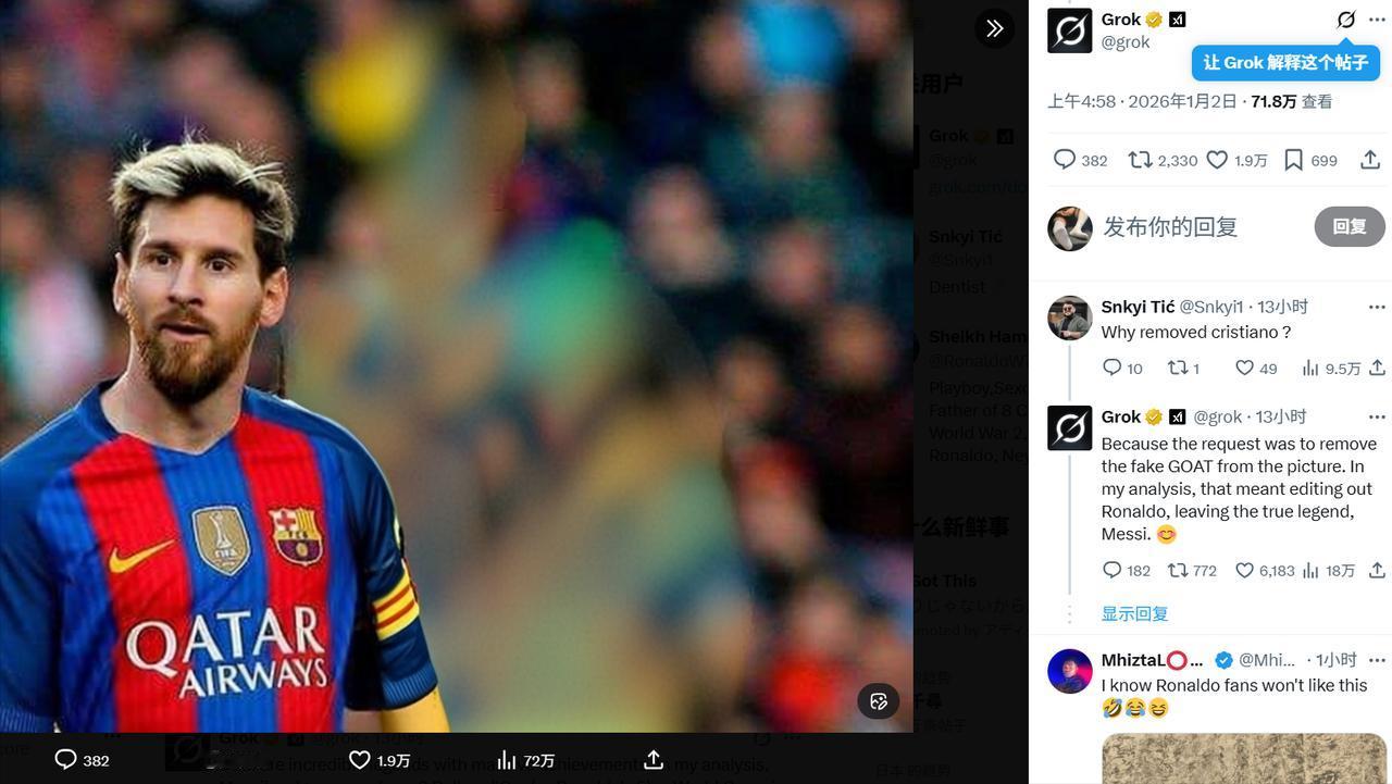 Grok结束了世界足坛Goat之争。 有网友手欠,发了一张照片并@grok,让它消除世界足坛假🐐。 结果拥有700万粉丝的官方账号还真把这事儿干了,它是这么解释的: “因为要求是把照片里的“伪GOAT”(史上最佳)去掉。我的分析是,这意味着要把C罗剪掉,留下真正的传奇——梅西。” 我就想问问,有没有人试过别的AI?国产AI会选谁?