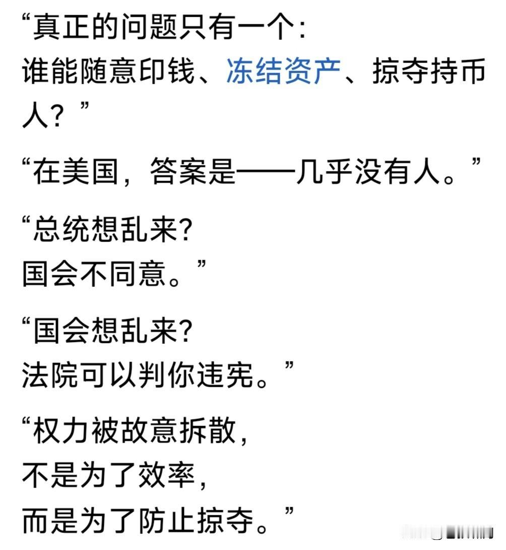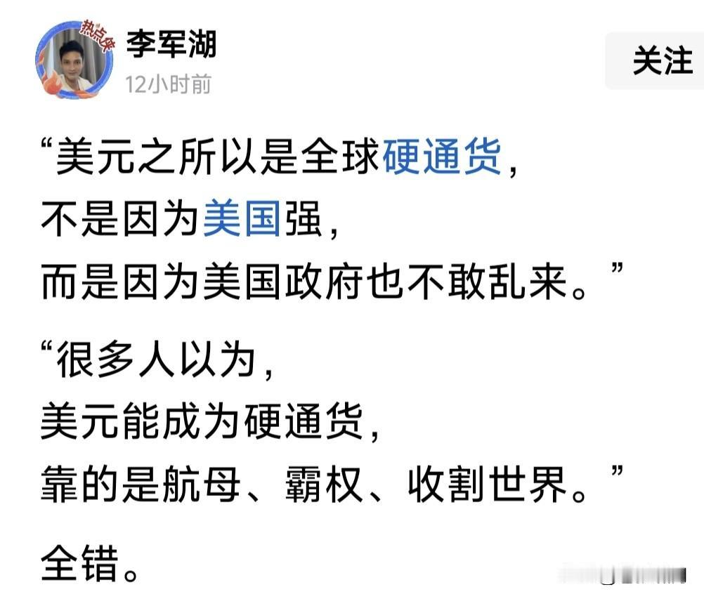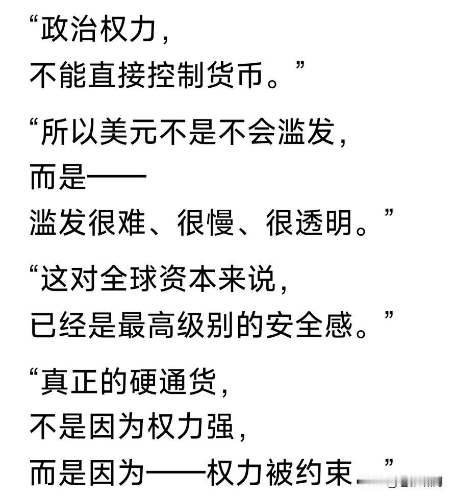 网友解读美元霸权:都说美元称霸全球收割世界,是因老美实力强大!其实大错特错。真正的原因是老美讲信用,从不乱印货币,保持美元坚挺! 美国的印钞权,不在总统手里,而在美联储!美联储不拿政府工资,总统干预不了。总统干预美联储,有国会拦着。国会若干预,法院判你违宪! 金融由经济决定!货币利率与印刷,由美联储根据市场形势决定,其他任何人无权干预。这就是美元坚挺,一直讲信用,称霸世界的原因所在。 当今世界货币世界流通,美元长期占半壁江山,欧元占30%份额,其他排列是英日加元与人民币。四国货币合在一起仅占20%。说明什么问题? 我们常说老美外债几十万亿!为何美元仍是世界最信任货币?原因就是美元坚挺值钱,欧元经济实力次之。其他国家势单力薄,别想冲击美元! 我也经常在想,既然美外债几十万亿!为何不增发货币,冲掉这个缺口不就行了?原来政府无权增发!增发货币非同小可,事关国家信誉,也是国家实力象征!谁敢拿这件事开玩笑? 前段时间,老听人说“冲击美元霸权”!现在看来只是笑话。真要冲击美元,恐怕受伤的还是自己!要想自己的货币强大,还是要让经济发展呐!经济科技上去了,货币自然就强大了! …………