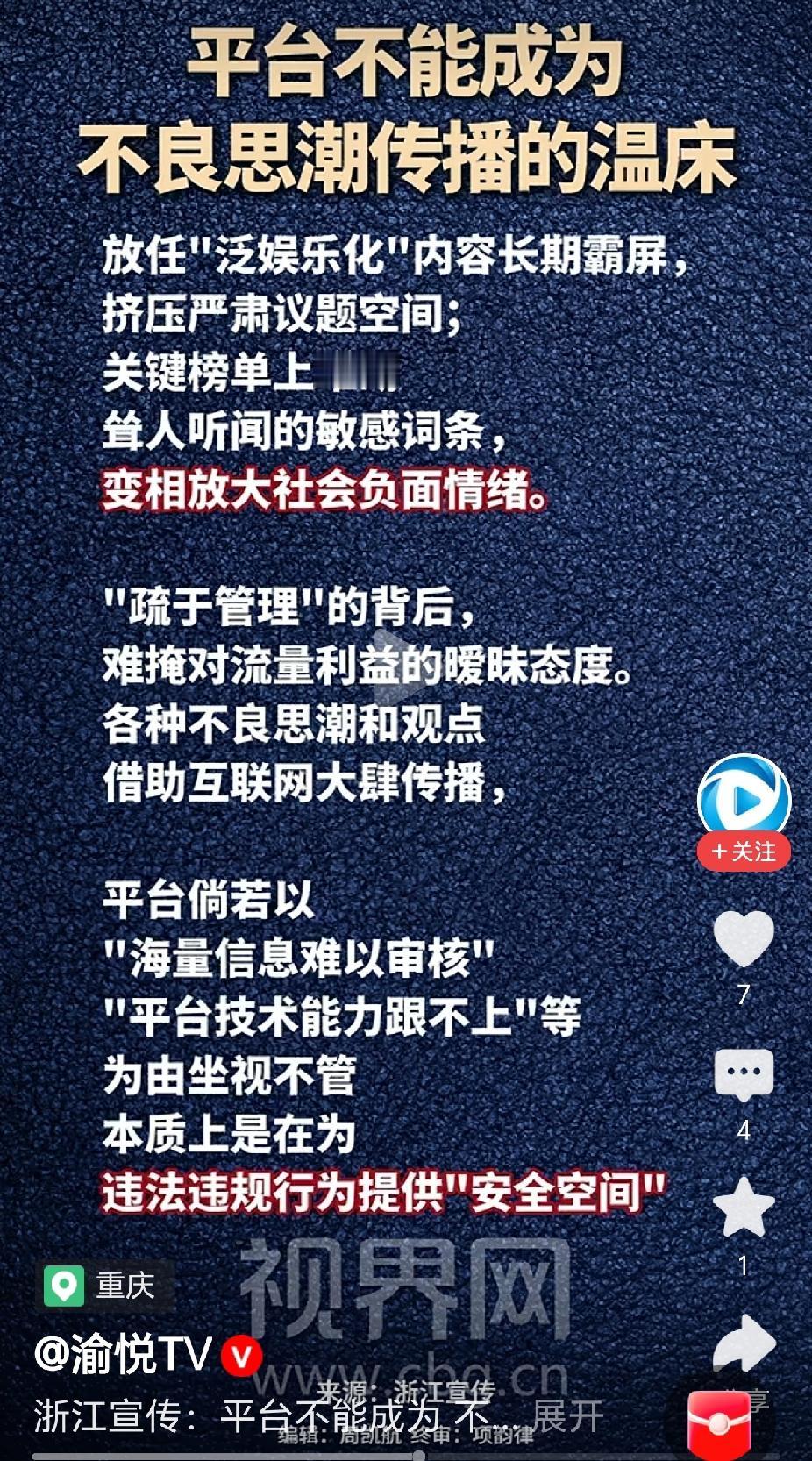 浙江宣传:平台不能成为不良思潮传播的温床! 历史虚无主义,极端女权主义,泛娱乐主义,1644史观等……大行其道,各平台难辞其咎! 还得是浙江宣传,敢发声!能发声!愿发声!而且次次落地有声! 浙江宣传