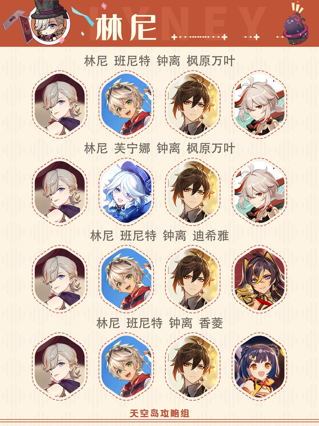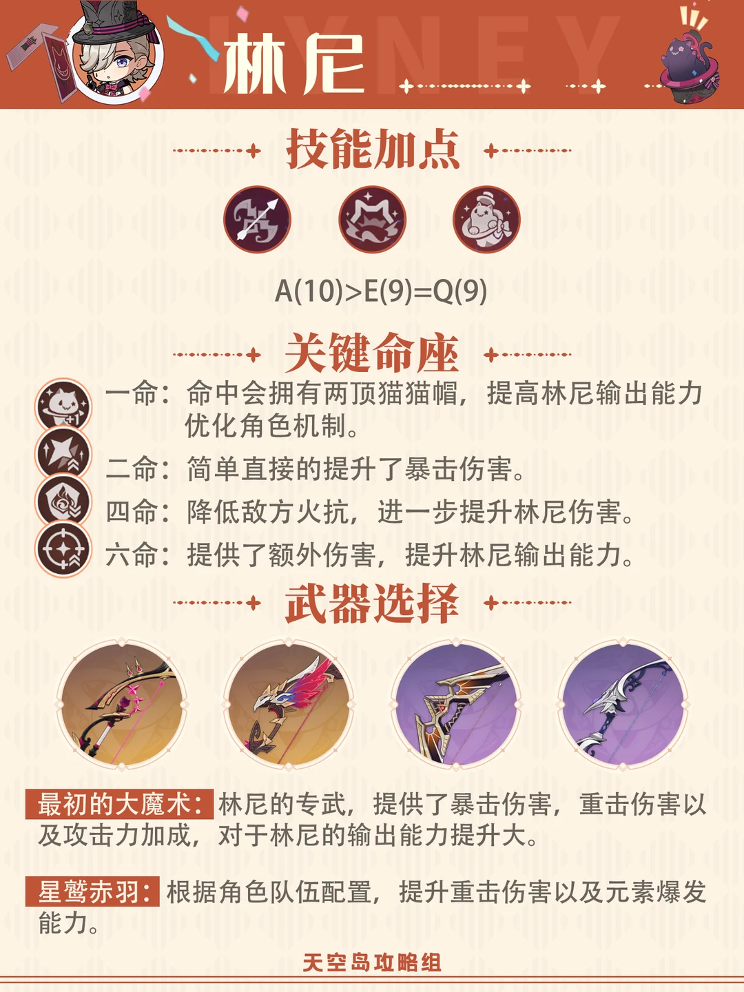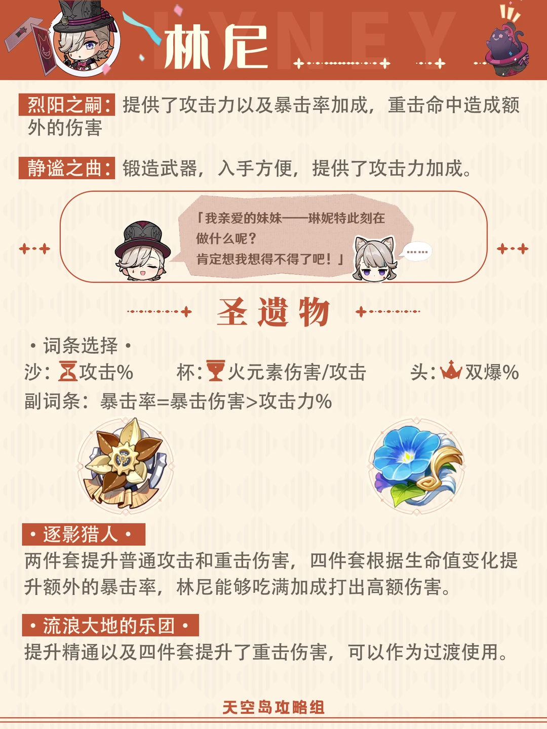 火系蓄力弓!枫丹特产向导 请看林尼的攻略吧[哇R] 1⃣建议天赋:A普攻(10)>E战技(9)=Q爆发(9) 2⃣武器选择: 最初的大魔术(专武)、星鹫赤羽、烈阳之嗣、静谧之曲(锻造) 3⃣️圣遗物:逐影猎人、流浪大地的乐团 攻击%沙、火元素伤害/攻击杯、双爆%头 副词条:暴击率=暴击伤害>攻击力% 4⃣️配队 林尼+班尼特+钟离+枫原万叶 林尼+芙宁娜+钟离+枫原万叶 林尼+班尼特+钟离+迪希雅 林尼+班尼特+钟离+香菱