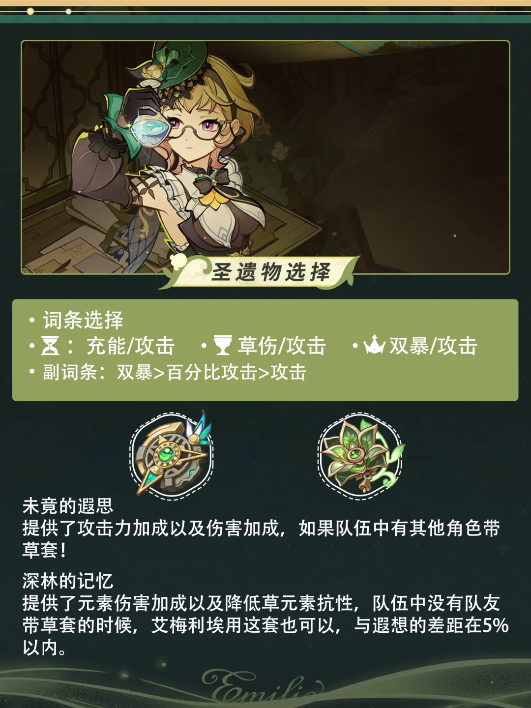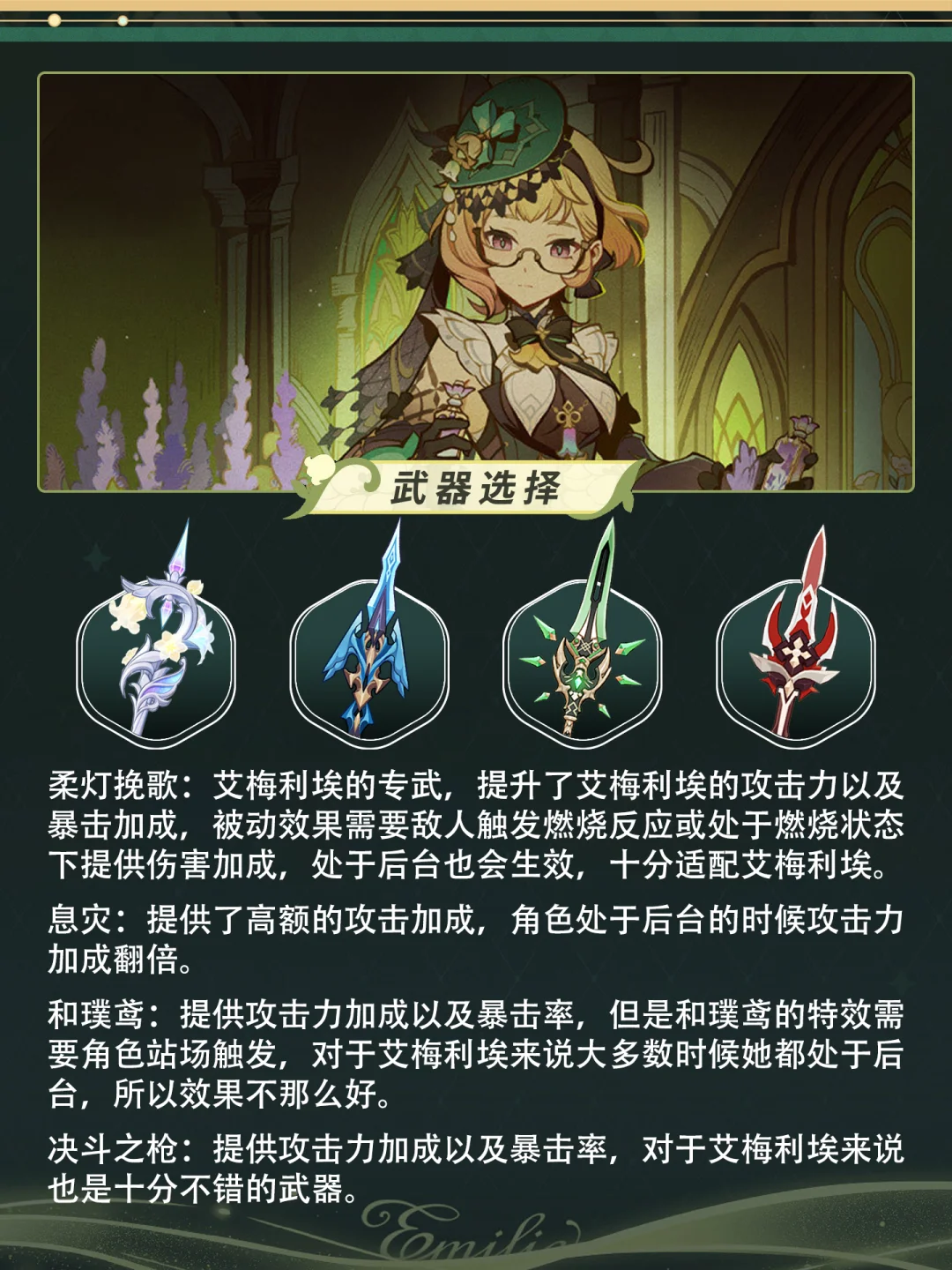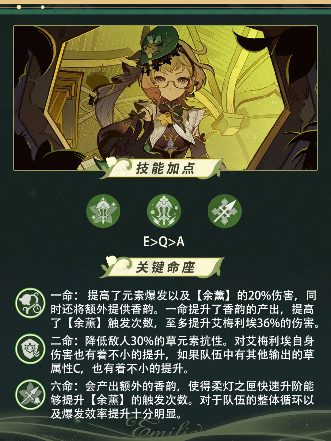 「调香师」艾梅莉埃已🆙[哇R] 她可作为草元素副C,走燃烧流进行后台输出。