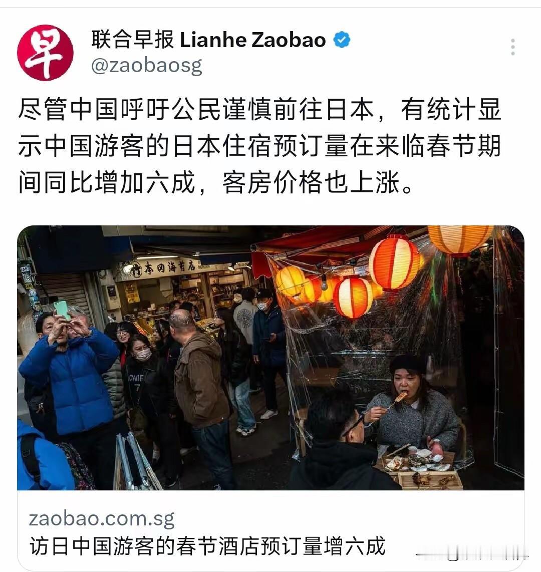 新加坡联合早报今天(1月2日)报道:“尽管中国呼吁公民谨慎前往日本,有统计显示中国游客的日本住宿预订量在来临春节期间同比增加六成,客房价格也上涨。” 这组数据看着实在有些讽刺。一边是有关部门基于两国关系的现状,发出谨慎前往的提醒;另一边却是春节赴日游预订量逆势大涨六成,酒店价格水涨船高。 这种“提醒归提醒,旅行归旅行”的明显反差,反映出的问题恐怕不止于旅游选择本身。 首先值得思考的是,在出境旅游热潮中,我们应当强化安全意识,将外交提醒作为重要参考,实现个人出行与国家关切的良性互动。 当宏观层面的谨慎呼吁,与个体消费行为形成如此巨大的温差时,它传递给外界尤其是对方国家的信号可能是复杂甚至混乱的。 对方社会很容易将这种民间热度误解为“关系紧张不影响民间好感”,从而低估了中方在原则问题上的郑重立场。 其次,从产业角度看,这部分旺盛的出境消费力,本可成为提振国内旅游市场、促进内循环的一股助力。 尤其是在春节这个传统消费旺季,大量高端旅游需求外流,对于仍在复苏中的国内文旅行业,不能不说是一种遗憾。 我们并非不鼓励正常的跨国交流,但在当前节点,公民的个人选择如何能与国家整体的外交态势、经济导向形成更有默契的协同,值得各界深思。 更深一层看,部分社交媒体上流传的所谓“低调游玩攻略”,教人如何隐藏身份、回避话题,旅游本应是放松身心的愉快体验, 如果还需要带着“谨言慎行”的包袱,甚至怀揣一种微妙的“愧疚感”,那么这场旅行的初衷是否已然变味?这究竟是一种成熟的“理性”,还是一种对潜在风险的刻意淡化? 小编认为,公民的旅行自由固然应当尊重,但在特殊时期,个人的消费选择也确实具有超越个体层面的象征意义。 它既是一种市场行为,也可被解读为一种民意的间接传达。当前中日关系处于敏感复杂的阶段,每一个微观的社会现象都可能被置于宏观的透镜下审视。 因此,在规划一次愉快的旅程时,或许我们也该多想一步:自己的选择,是在为何种未来投票?真正的理性和成熟,不仅在于计算汇率与性价比,也在于能否将个人的便利,置于国家关系与长远福祉的大局中加以权衡。 一个强大而自信的公民社会,其力量恰恰体现在,能于风浪中保持集体性的战略清醒与定力。