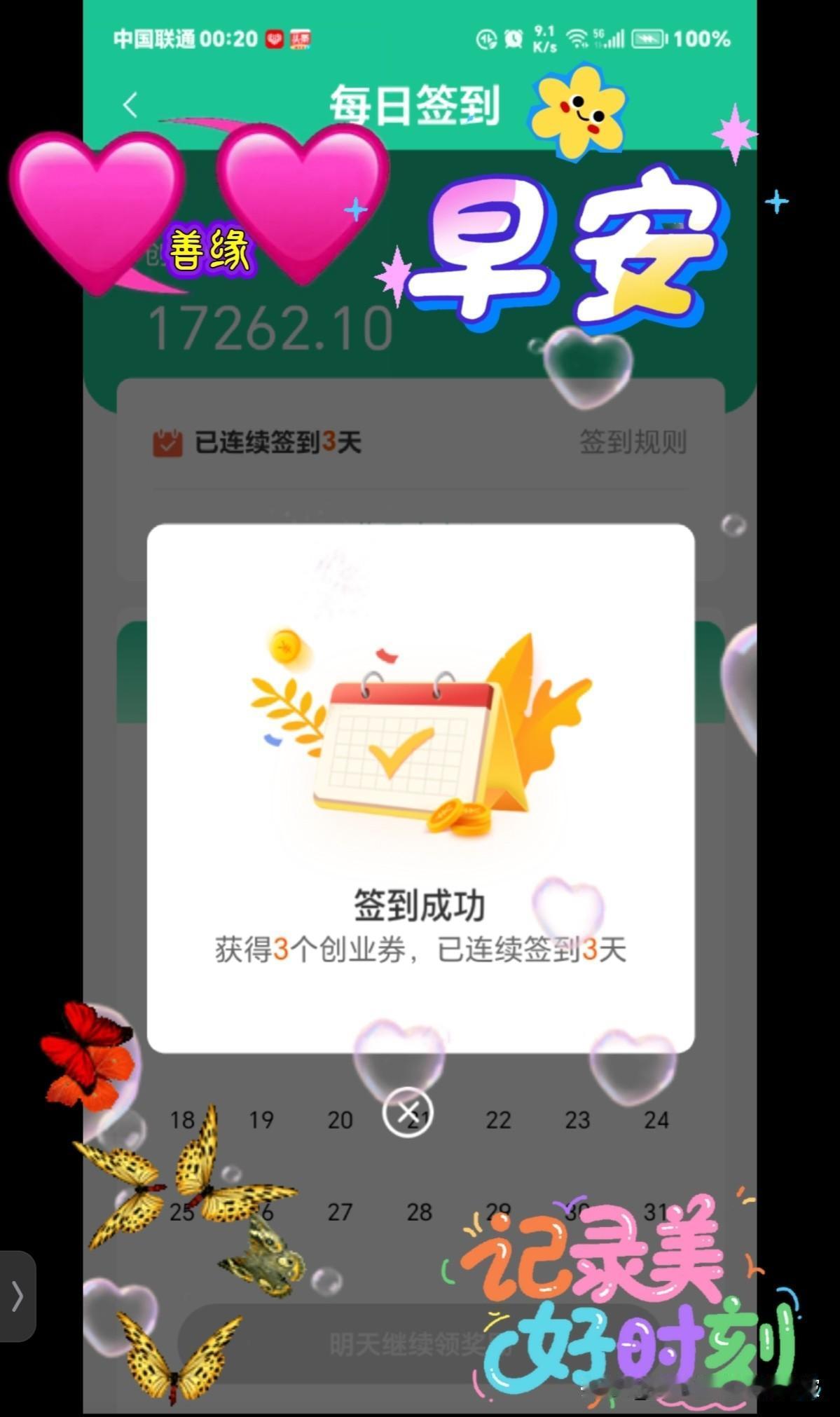 今天是2026年1月3日,签到成功,获得3个创业卷,已连续签到三天! 宁静的早晨