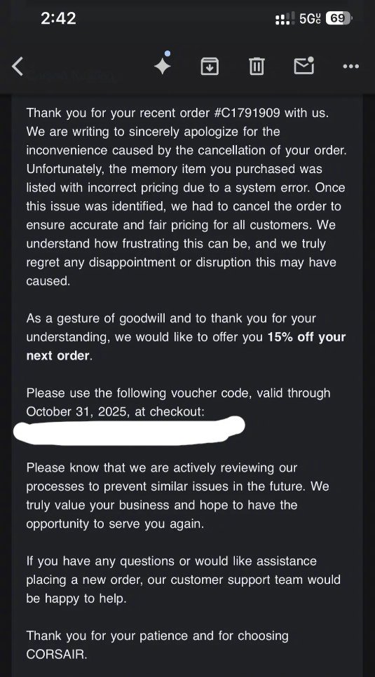 [美商海盗船因“DDR5内存定价错误”而砍单,补偿优惠券竟已过期]美商海盗船因“DDR5内存定价错误”单方面取消用户订单,补偿的15%优惠券竟早在10月底就已过期,引发用户新一轮不满。#科技圈那些事儿##海盗船砍单#