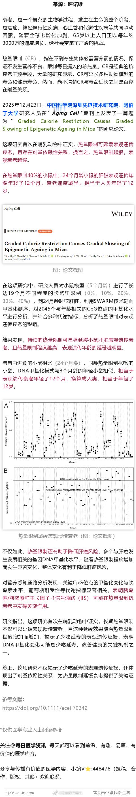 年轻12岁!Aging Cell:热量限制越狠,衰老越慢,饭吃六分饱,表观年龄年轻12岁2025年12月23日,中国科学院深圳先进技术研究院、阿伯丁大学研究人员在" Aging Cell "期刊上发表了一篇题为" Graded Calorie Restriction Causes Graded Slowing of Epigenetic Ageing in Mice "的研究论文。这项研究首次在哺乳动物中证实,热量限制可延缓表观遗传衰老,且存在剂量依赖性关系,换言之,热量限制越狠,表观衰老越慢。在热量限制40%的小鼠中,24个月龄小鼠的肝脏表观遗传年龄年轻了12个月,衰老速度减半,相当于人类年轻了12岁。