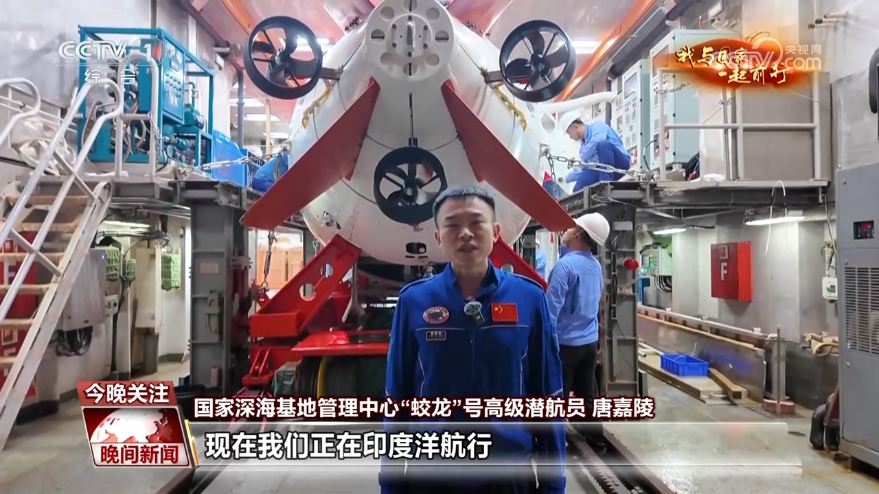 国家深海基地管理中心“蛟龙”号高级潜航员唐嘉陵:大家好,我是“蛟龙”号高级潜航员唐嘉陵,很高兴又在《晚间新闻》栏目和大家见面了。我们现在正在印度洋航行,执行海洋生态环境调查任务。现在是(当地时间)早上的六点,“蛟龙”号正在备潜,这一次我将作为主驾驶执行下潜任务,这也是“蛟龙”号(2025年)的第91次下潜,今天也是“蛟龙”号(2025年)在海上的第286天。