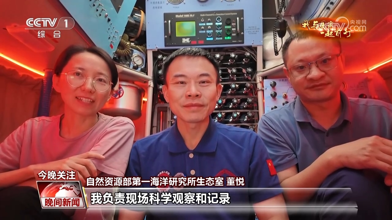 国家深海基地管理中心“蛟龙”号高级潜航员唐嘉陵:这是我们今天一起下潜的三人小组,来和大家打个招呼。