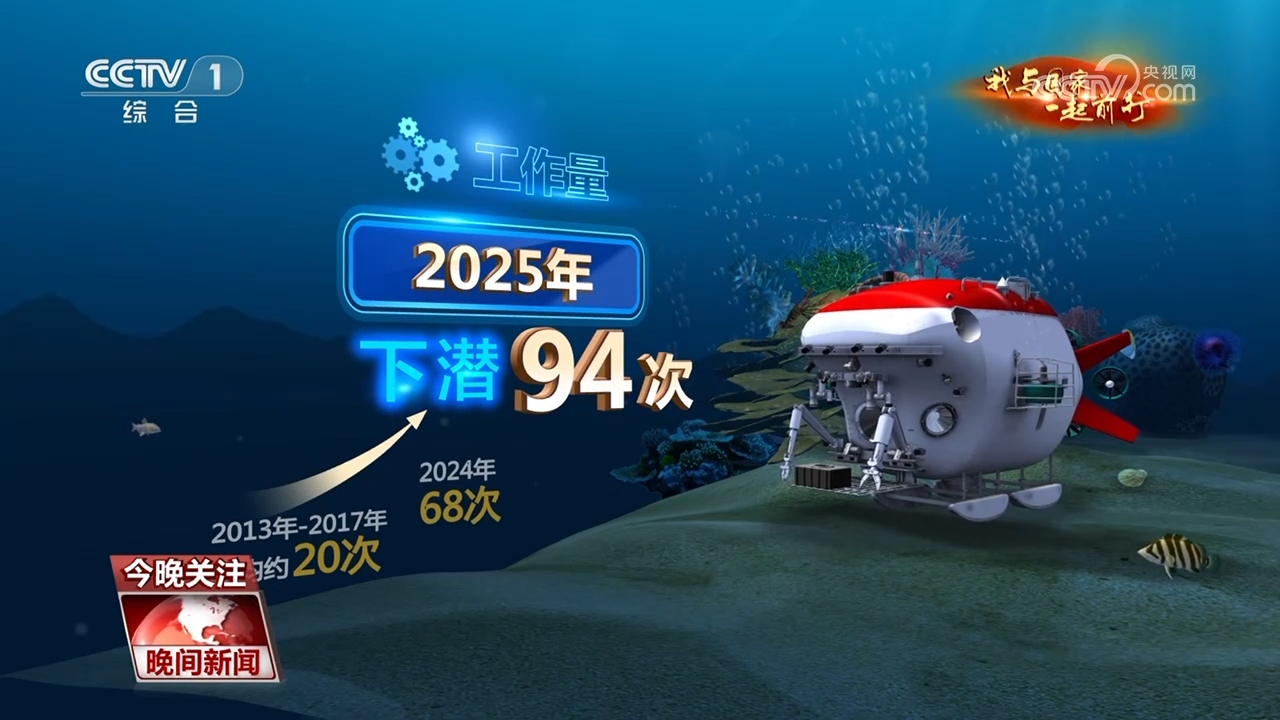 再来看工作量。从2013年到2017年,整个五年,蛟龙号共下潜接近100次,年均大约20次。而2024年,“蛟龙”号下潜了68次,2025年,下潜了94次。