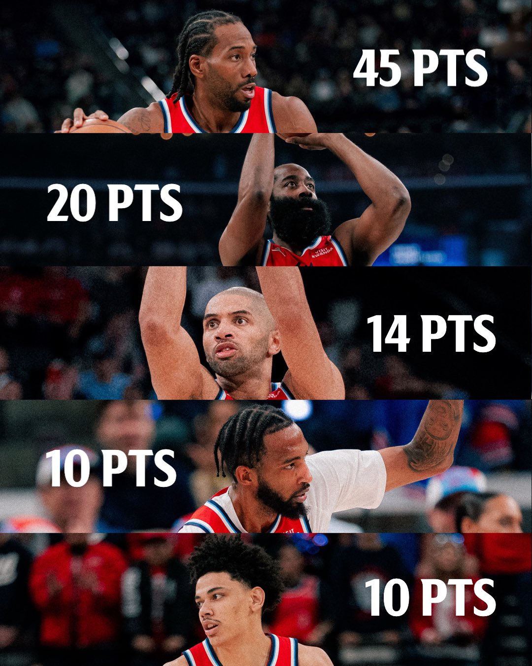 昨日比赛中,快船全队5人得分上双,科怀-伦纳德得到全场最高的45分。