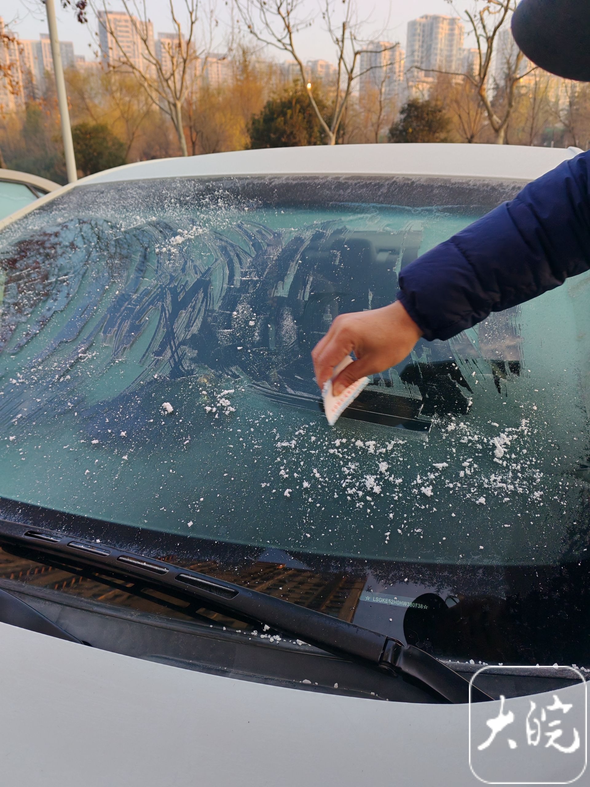 1月3日早晨,一位合肥市民在清除车前挡玻璃上的冰霜。