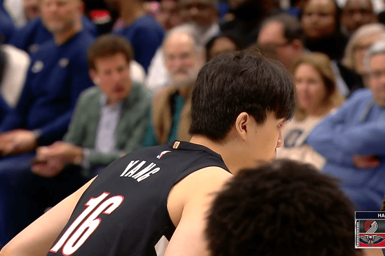 第一节比赛中,杨瀚森首节还剩4分钟替补上场,继续搭档罗威双塔出战。
