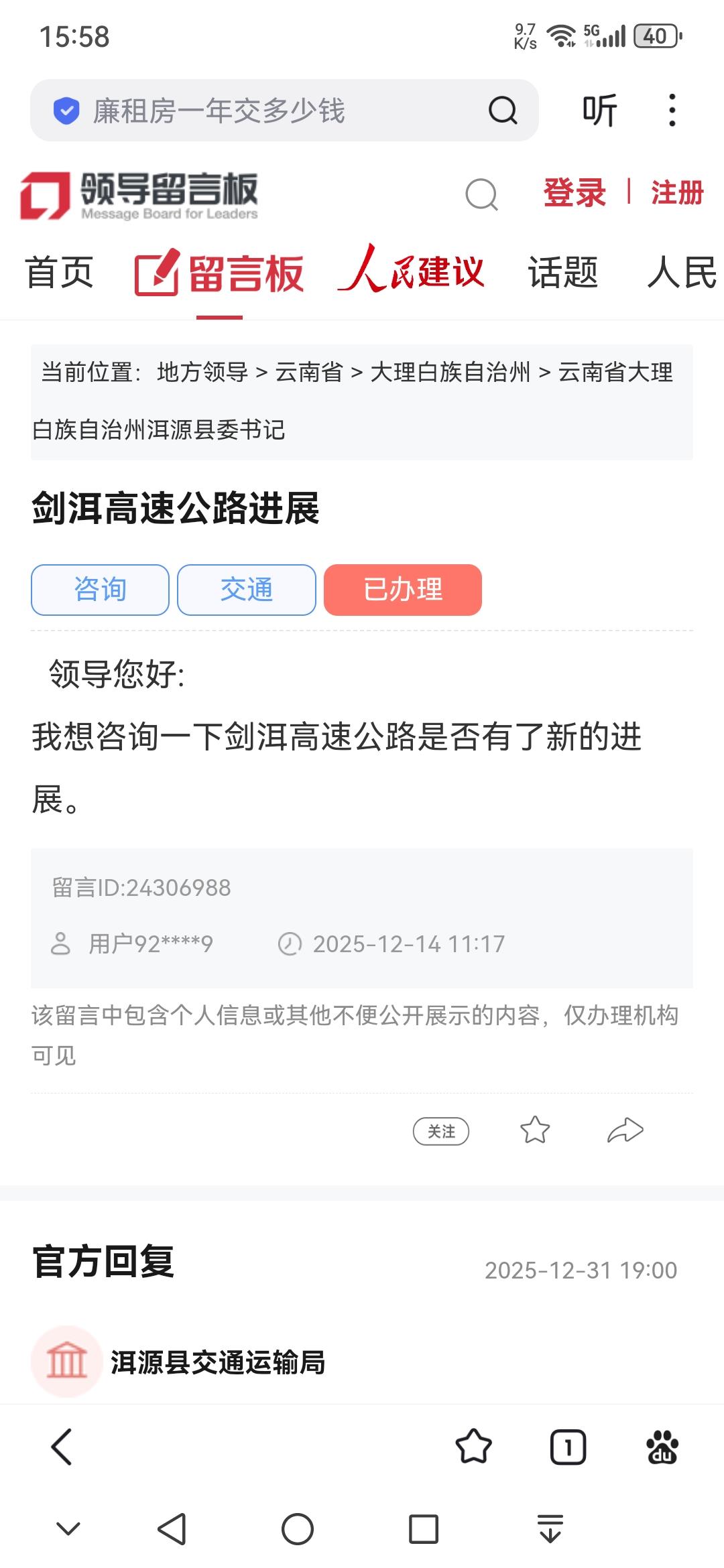 2025年12月14日,一位网友通过人民网领导留言板向洱源县委书记咨询剑洱高速公