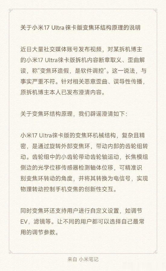 新浪科技讯1月3日上午消息,@小米公司发言人发文回应“小米17Ultra徕卡版变焦环造假”一事,称近日大量社交媒体账号发布视频,对某拆机博主的小米17Ultra徕卡版拆机内容断章取义、歪曲解读,称“变焦环造假,是软件调控”。这一说法,与事实严重不符。针对相关恶意歪曲、误导性传播,原拆机博主本人已发布澄清内容。