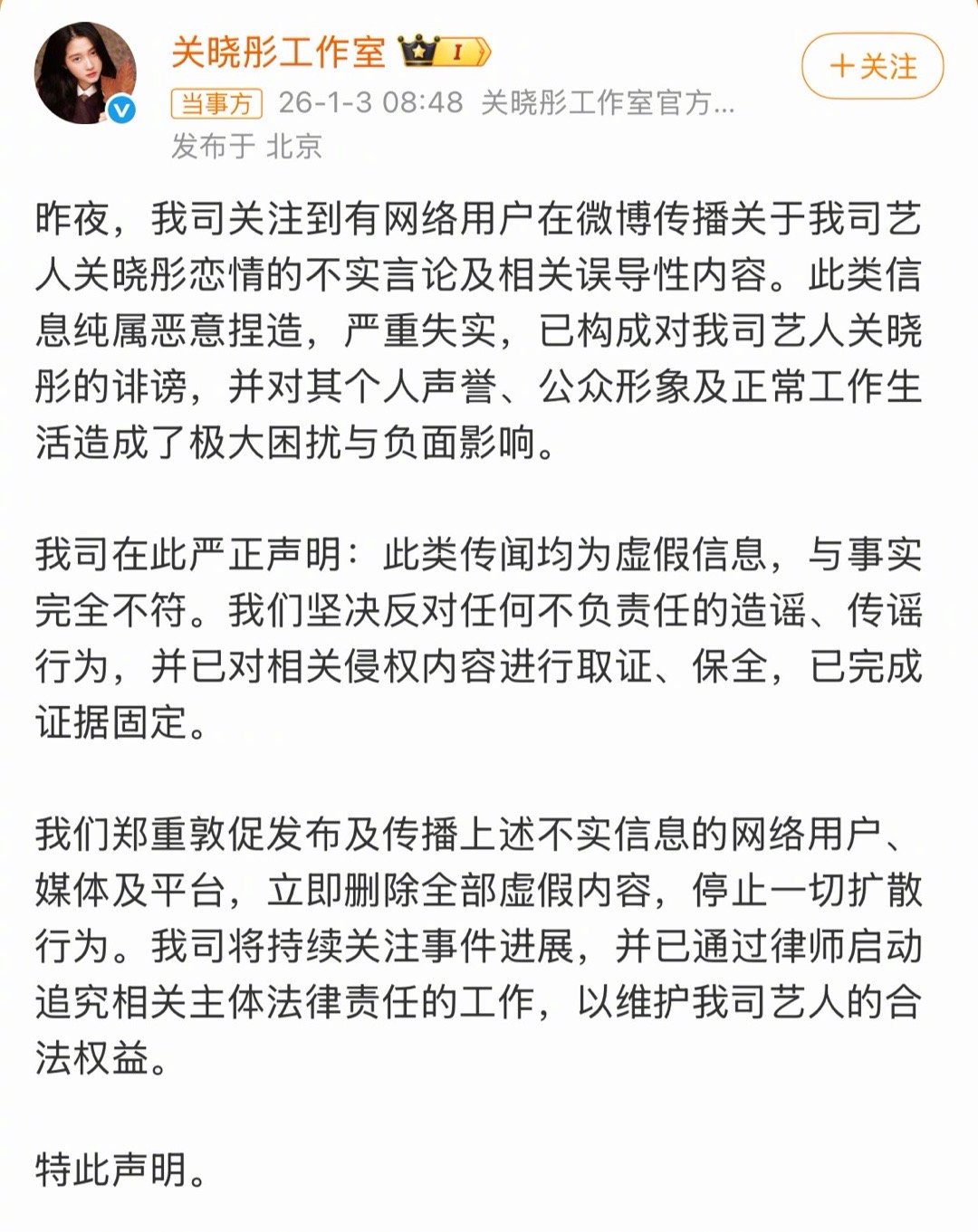 王安宇工作室辟谣与关晓彤恋情司晓迪在粉丝群爆料王安宇和关晓彤在一起了,王安宇工作室和关晓彤工作室都发文辟谣了。 关晓彤工作室严正声明