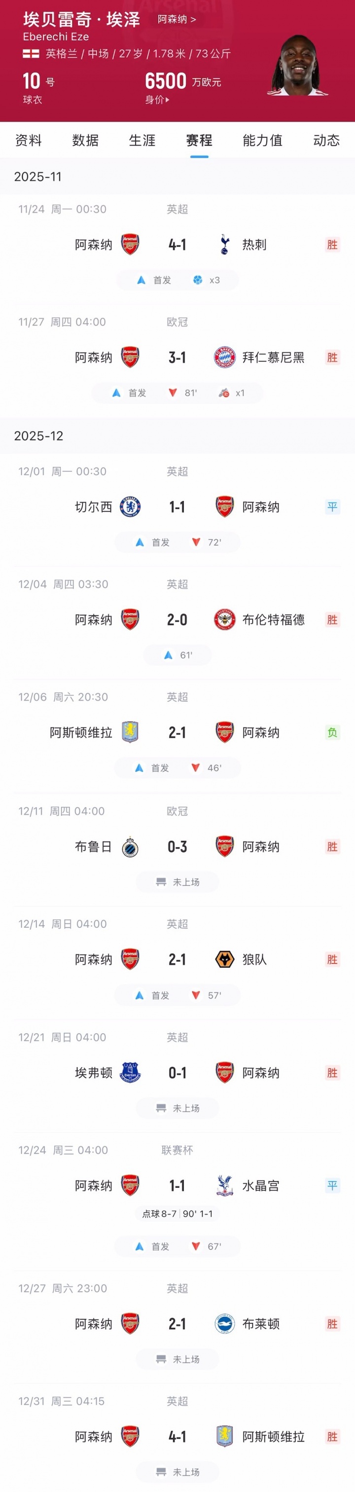 直播吧01月03日讯阿森纳即将在2026年首战客战伯恩茅斯,而值得关注的是,枪手去年夏天高价引进的埃泽已经连续3轮英超没能出场。