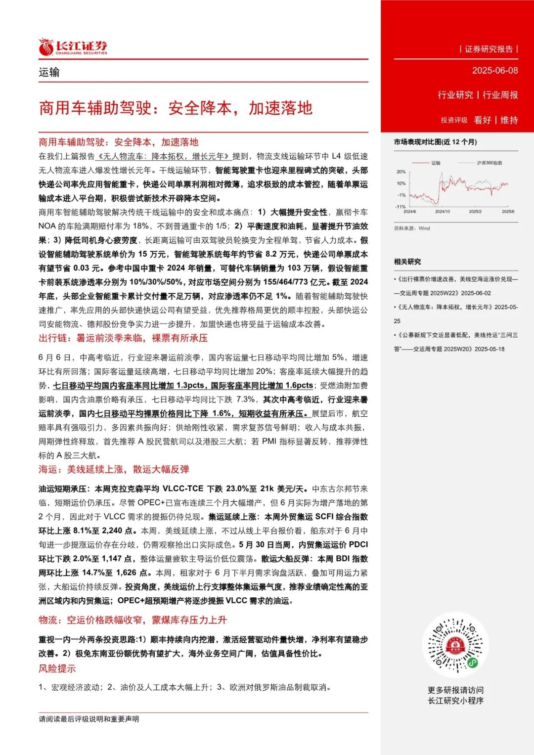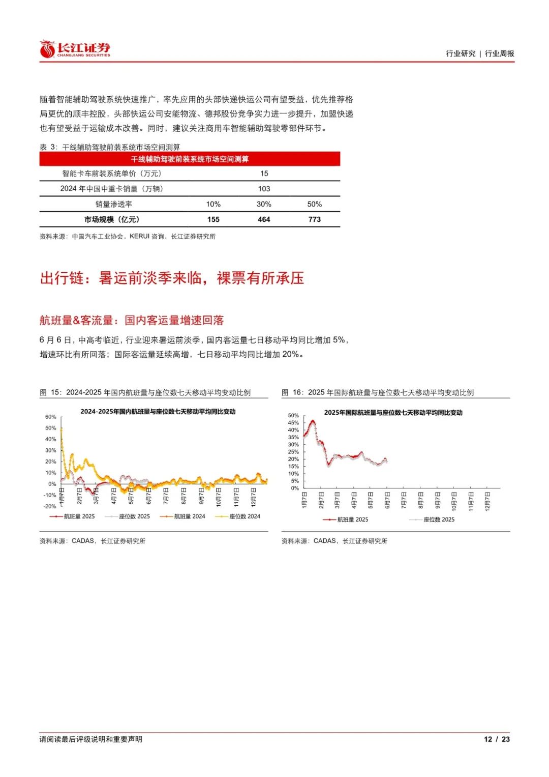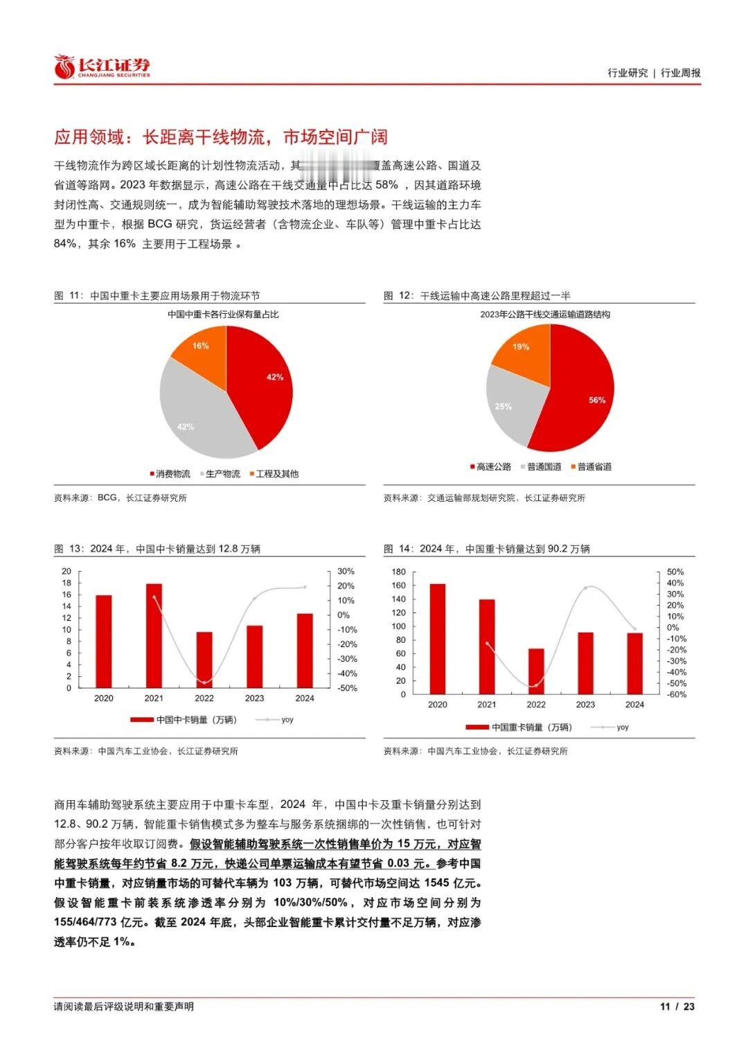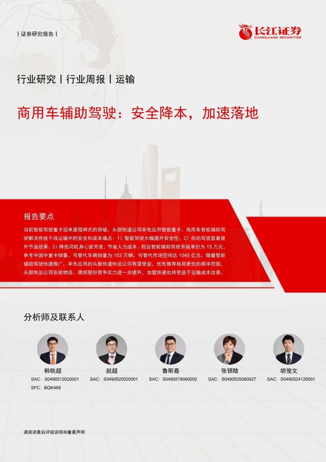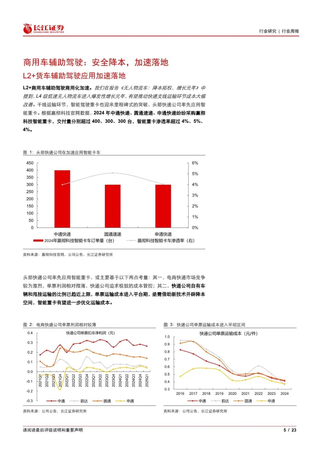当前智能驾驶重卡迎来里程碑式的突破,头部快递公司率先应用智能重卡。商用车智能辅助驾驶解决传统干线运输中的安全和成本痛点:1)智能驾驶大幅提升安全性;2)自动驾驶显著提升节油效果;3)降低司机身心疲劳度,节省人力成本。假设智能辅助驾驶系统单价为15万元,参考中国中重卡销量,可替代车辆销量为103万辆,可替代市场空间达1545亿元。随着智能辅助驾驶快速推广,率先应用的头部快递快运公司有望受益。