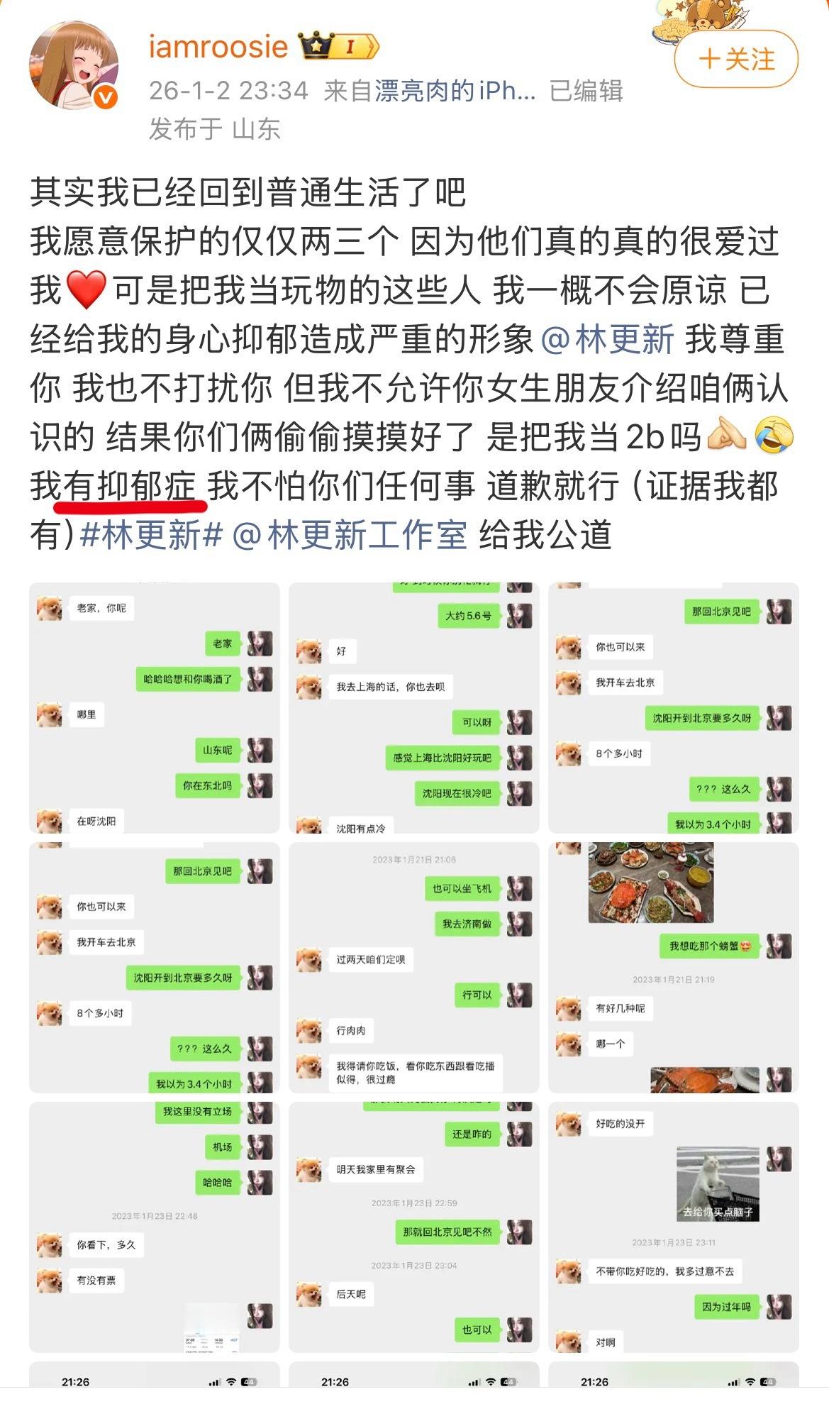 林更新工作室只有林更新方的回应是希望她早日康复,身心健康。为什么只有林更新方这么说呢?因为司晓迪女士只有发林更新的这条说自己有抑郁症,可是抑郁症不是拿来这么用的吧?占用别人的资源,诋毁了抑郁症这个病症群体。