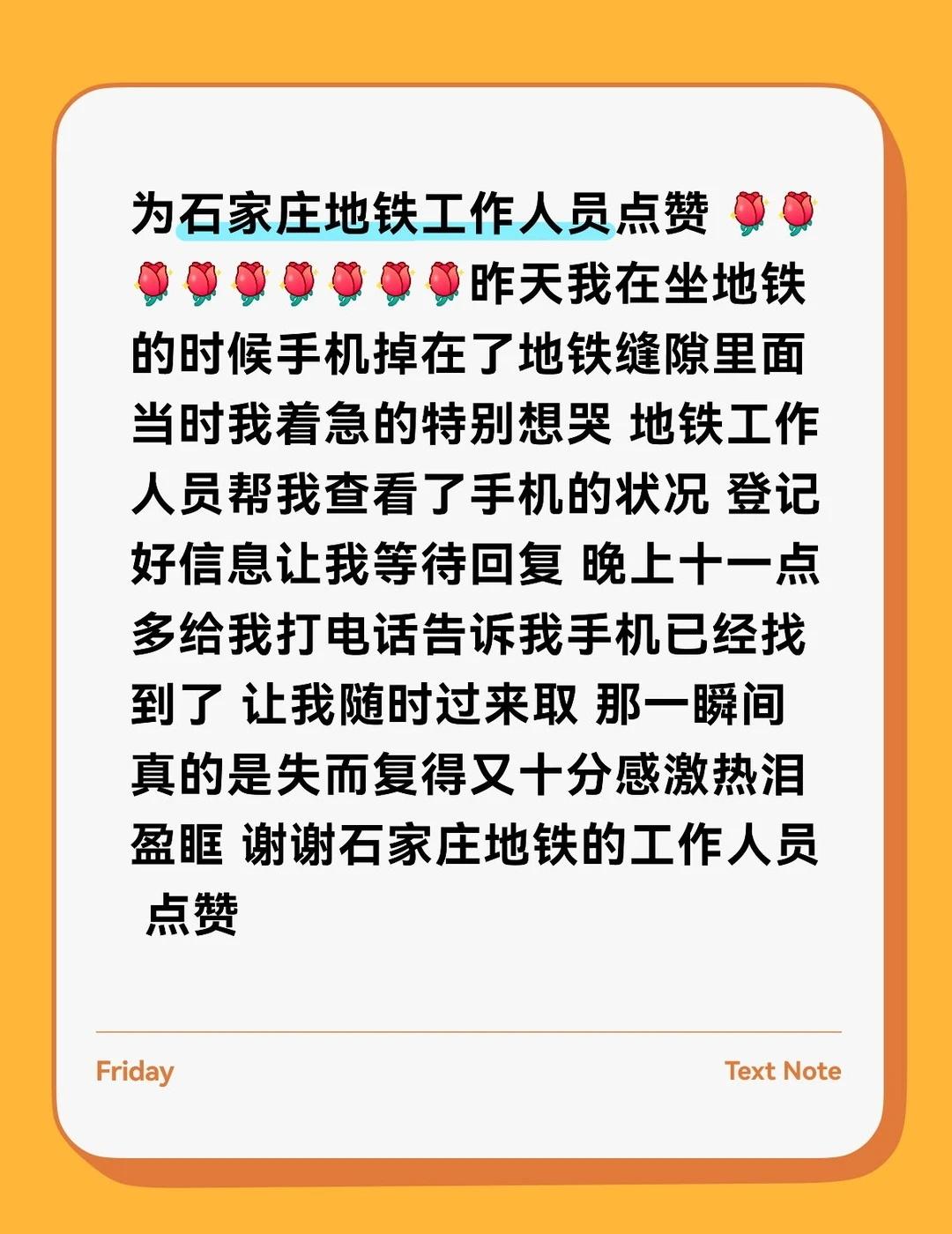 为石家庄地铁工作人员点赞 [玫瑰][玫瑰][玫瑰][玫瑰][玫瑰][玫瑰][玫瑰][玫瑰][玫瑰]昨天我在坐地铁的时候手机掉在了地铁缝隙里面 当时我着急的特别想哭 地铁工作人员帮我查看了手机的状况 登记好信息让我等待回复 晚上十一点多给我打电话告诉我手机已经找到了 让我随时过来取 那一瞬间真的是失而复得又十分感激热泪盈眶 谢谢石家庄地铁的工作人员 点赞