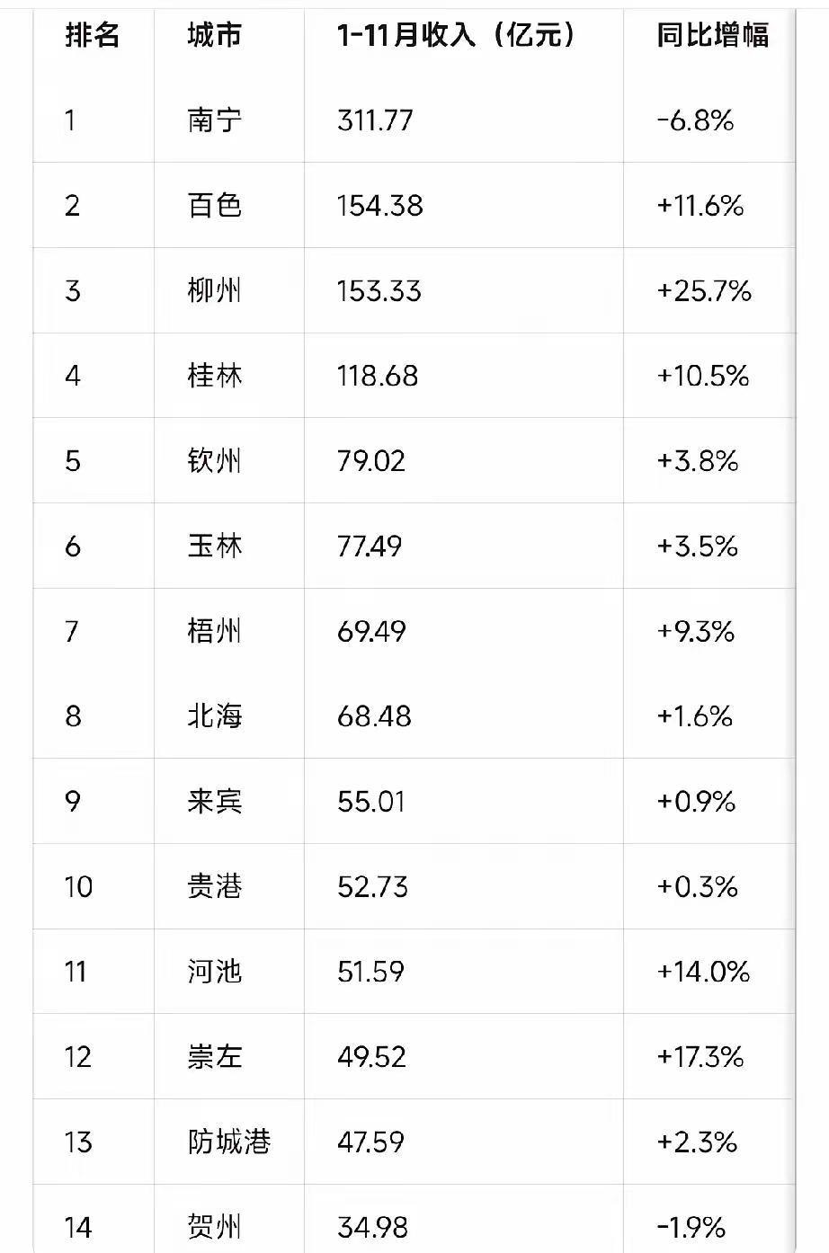 广西各市1-11月地方财政出炉:百色领先柳州、梧州超北海、贵港河池旗鼓相当 广西2025年1-11月地方财政收入完成1638.58亿,截止目前,广西各市1-11月地方财政收入都已经出炉了,从各市财政增速来看,南宁和贺州较去年同期为负增长,其余各市都实现了不同幅度的增长。 论经济总量,柳州远远领先于百色,单论地方财政收入,百色则领先柳州1.05亿,这两座城市分别完成154.38亿和153.33亿。 梧州和北海分别完成69.49亿和68.48亿,同比增长9.3%和1.6%,北海财政增速低于梧州,导致财政收入被梧州反超1.01亿。 贵港和河池1-11月地方财政收入旗鼓相当,分别完成52.73亿和51.59亿,位居全区第10-11名。