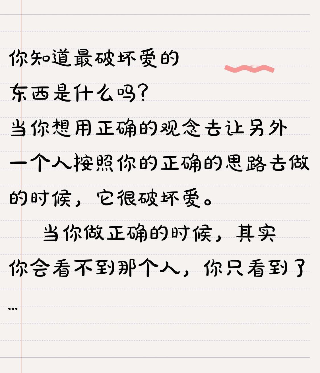 你知道最破坏爱的东西是什么吗? 当你想用正确的观念去让另外一个人按照你的正确的思路去做的时候,它很破坏爱。 当你做正确的时候,其实你会看不到那个人,你只看到了正确的事。对爱的解读