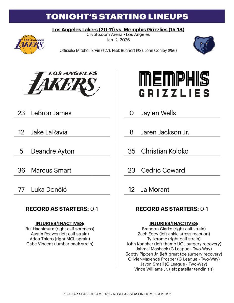 记者RyanWard报道,今晚孟菲斯灰熊队对阵洛杉矶湖人队的比赛首发阵容如下: