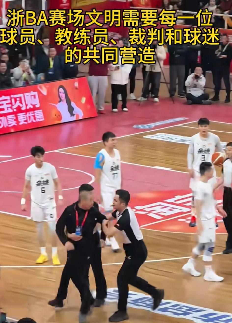 余姚队这位助理教练整的是哪出啊?网友吐槽:浙ba再这么打下去,“散装浙江”的这个名号无疑是坐实! 昨晚浙ba再赛一轮,在余姚vs诸暨的比赛中,场上发生了一段小插曲,疑是诸暨队的蒋官洋做了不好的动作,场上球员和裁判都没有说什么,场下的这位余姚助教不淡定了,直接冲上去要跟蒋对峙,好在裁判及时把他拦住,才不致事态进一步扩大。 浙ba预赛都近尾声了,余姚也铁定出不了线了,余姚这位助教到底怎么想的,真的很难理解! 网友锐评:浙ba赛场文明的比赛环境需要每一位球员、教练员、球迷和裁判共同来营造!