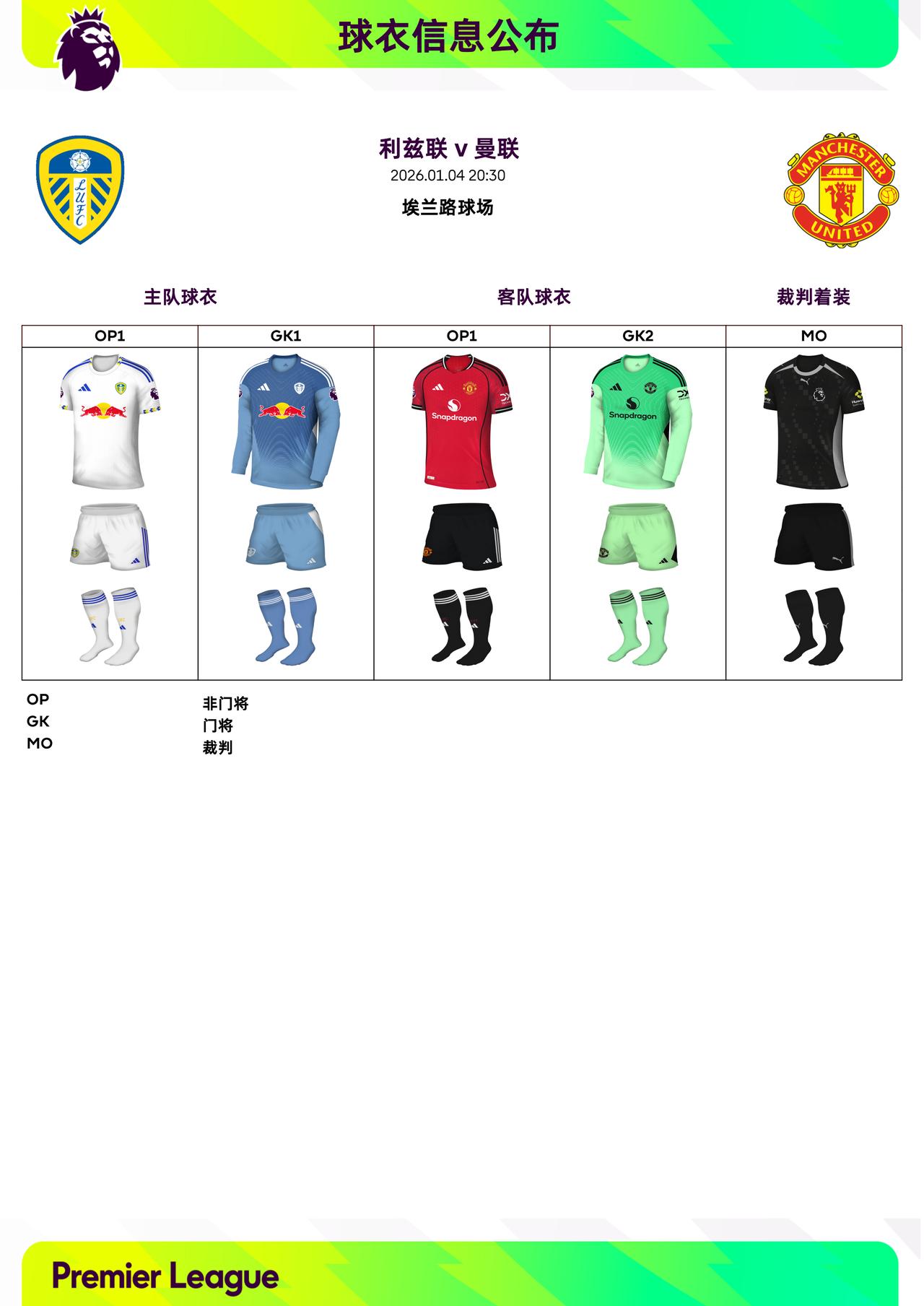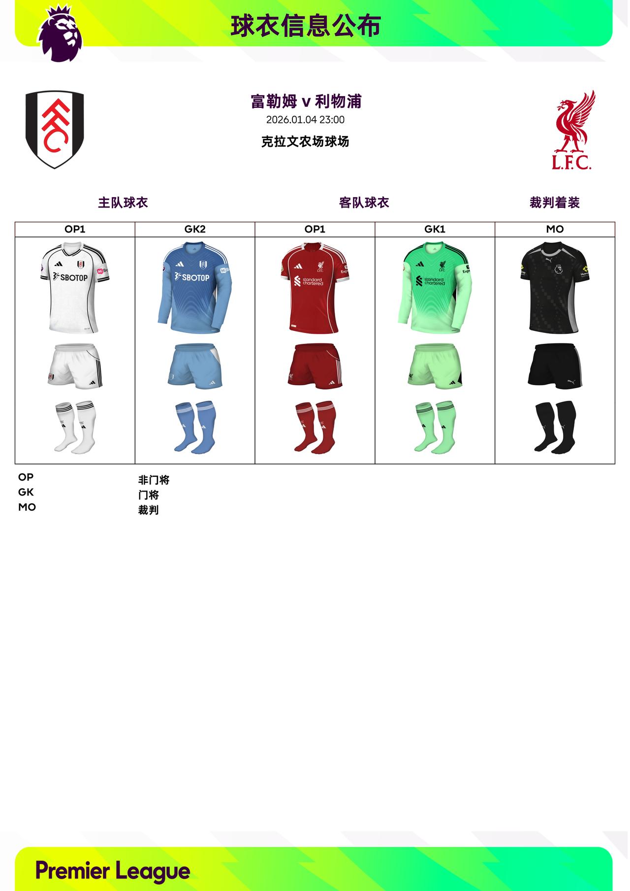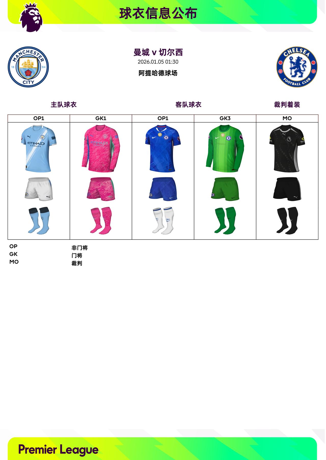 2025/26赛季英超联赛第20轮球衣信息: ◉ 焦点战——曼城 v 切尔西 ,双方均穿主场球衣,上演“双蓝会”