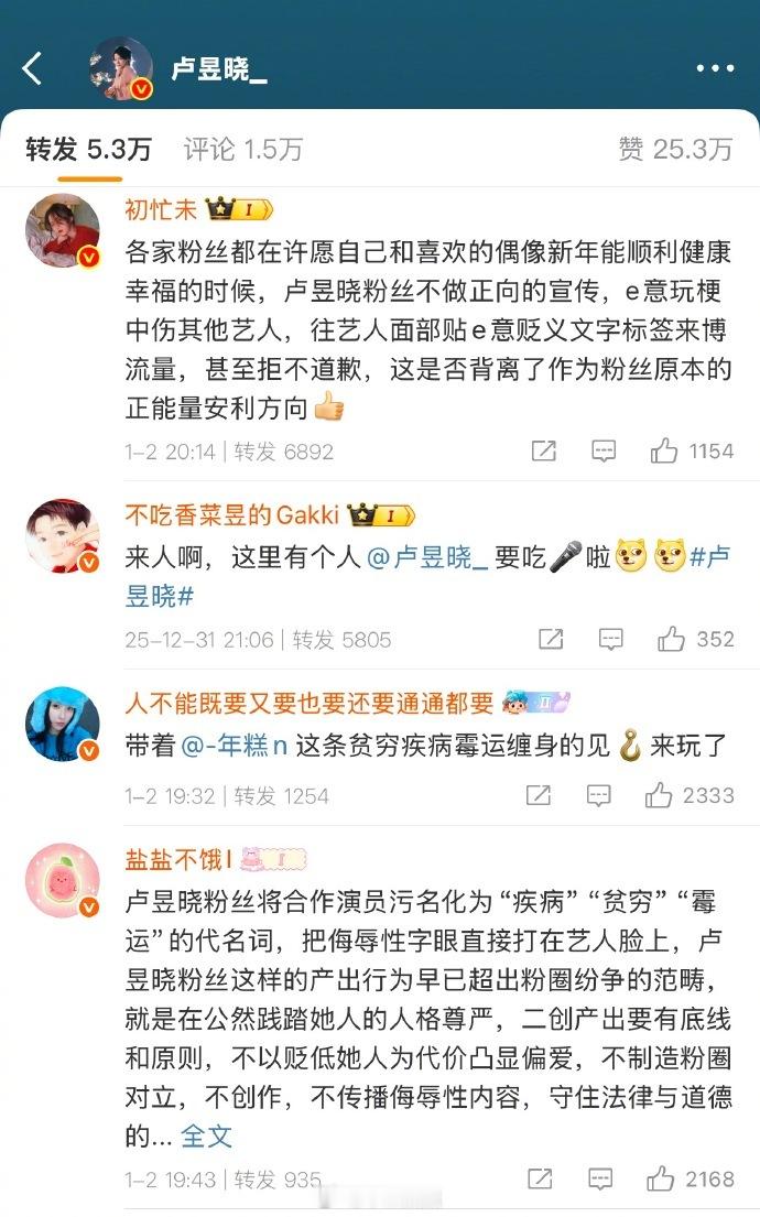 因为卢昱晓粉丝做的新年祈福视频把字p在虞书欣脸上,虞书欣粉丝要求卢昱晓粉丝道歉