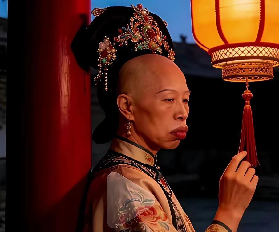 这打扮是啥意思啊? 看着真让人反胃! 干脆把前额头发剃光得了! 以后就一直这么打扮吧! 再穿上花盆底鞋,手上拿两块手绢, 尽情摇摆吧!