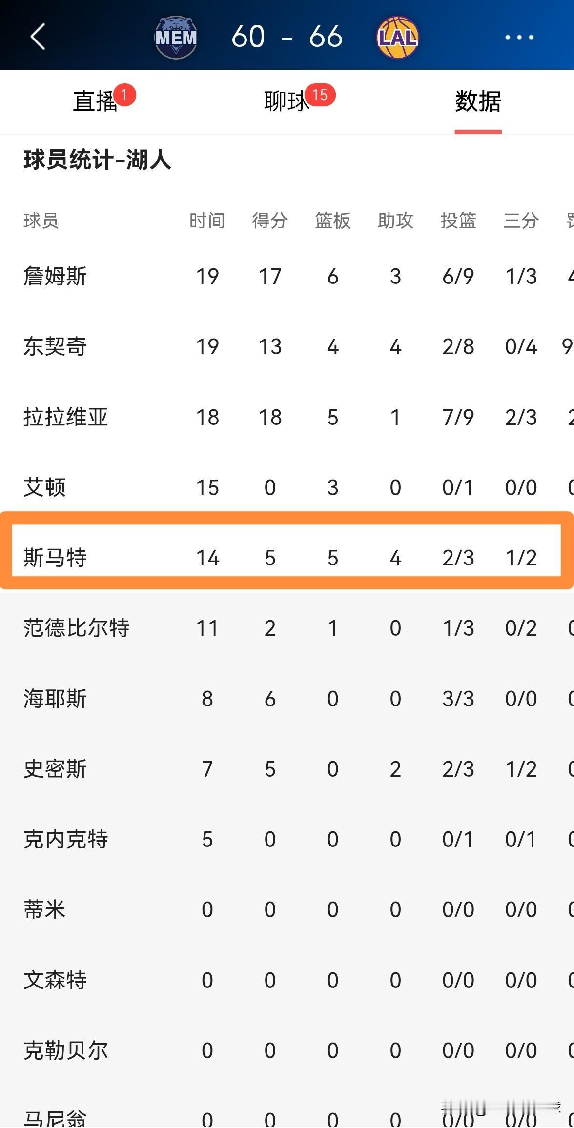 我实在忍不住要怒赞湖人大将斯玛特!在今天进行的湖人和灰熊的上半场比赛中,斯玛特真是攻防兼备,他在首发出战的14分钟里,投篮3中2,其中三分球2中1得到5分5篮板4助攻,他的场上正负值为全队最高的+18,帮助球队以66:60领先灰熊结束了前两节的比赛。 当斯玛特进入到球队的首发阵容后,他能够在防守端为球队注入活力和血性,在一定程度上带动了队友的防守积极性。
