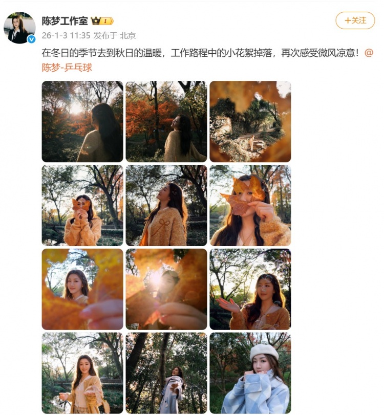 社媒配文写道:在冬日的季节去到秋日的温暖,工作路程中的小花絮掉落,再次感受微风凉意!