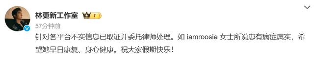 演员林更新工作室发文:“针对各平台不实信息已取证并委托律师处理。如iamroosie女士所说患有病症属实,希望她早日康复、身心健康。祝大家假期快乐!”