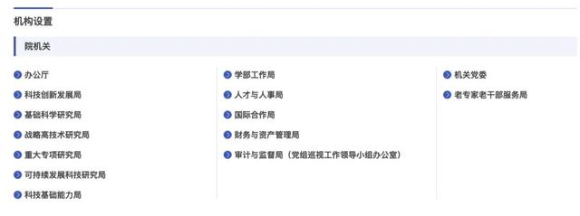 官网显示,目前,中科院院机关包括:办公厅、科技创新发展局、基础科学研究局、战略高技术研究局、重大专项研究局、可持续发展科技研究局、科技基础能力局,学部工作局、人才与人事局、国际合作局、财务与资产管理局、审计与监督局(党组巡视工作领导小组办公室),机关党委、老专家老干部服务局。